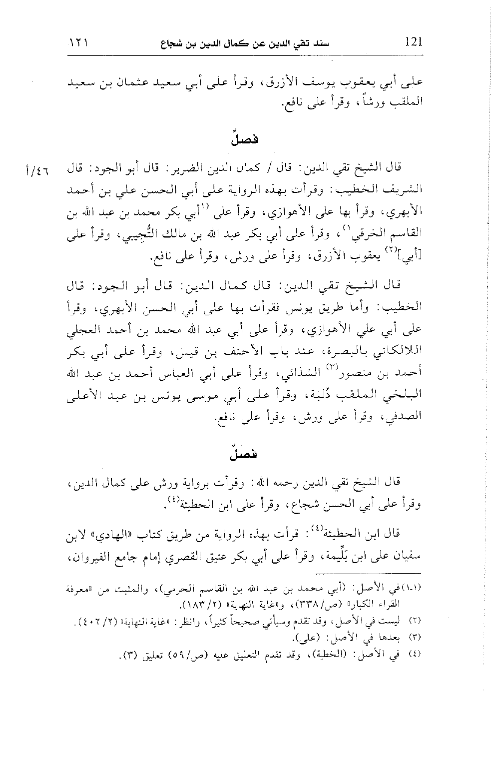 قال الشيخ تقي الدين: قال كمال الدين: قال أبو الجود: قال الخطيب: وأما طريق يونس فقرأت بها على أبي الحسن الأبهري، وقرأ على أبي علي الأهوازي، وقرأ على أبي عبد الله محمد بن أحمد العجلي اللالكائي بالبصرة، عند باب الأحنف بن قيس، وقرأ على أبي بكر أحمد بن منصور (¬3) الشذائي، وقرأ على أبي العباس أحمد بن عبد الله البلخي الملقب دلبة، وقرأ على أبي موسى يونس بن عبد الأعلى الصدفي، وقرأ على ورش، وقرأ على نافع.