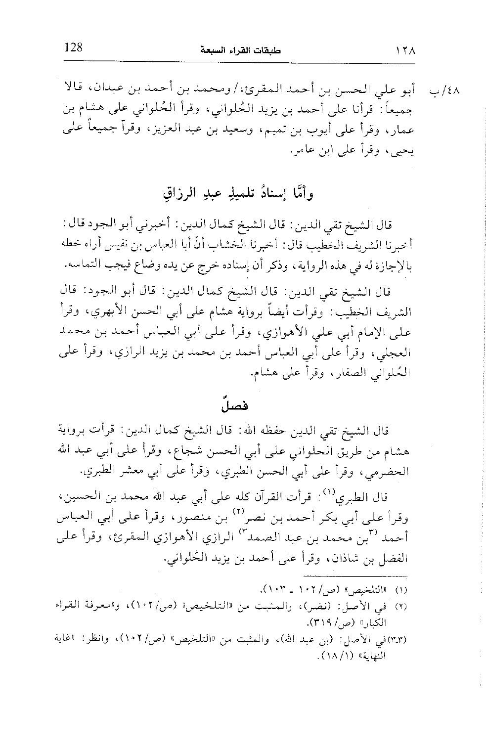 قال الشيخ تقي الدين: قال الشيخ كمال الدين: قال أبو الجود: قال الشريف الخطيب: وقرأت أيضا برواية هشام على أبي الحسن الأبهري، وقرأ على الإمام أبي علي الأهوازي، وقرأ على أبي العباس أحمد بن محمد العجلي، وقرأ على أبي العباس أحمد بن محمد بن يزيد الرازي، وقرأ على الحلواني الصفار، وقرأ على هشام.