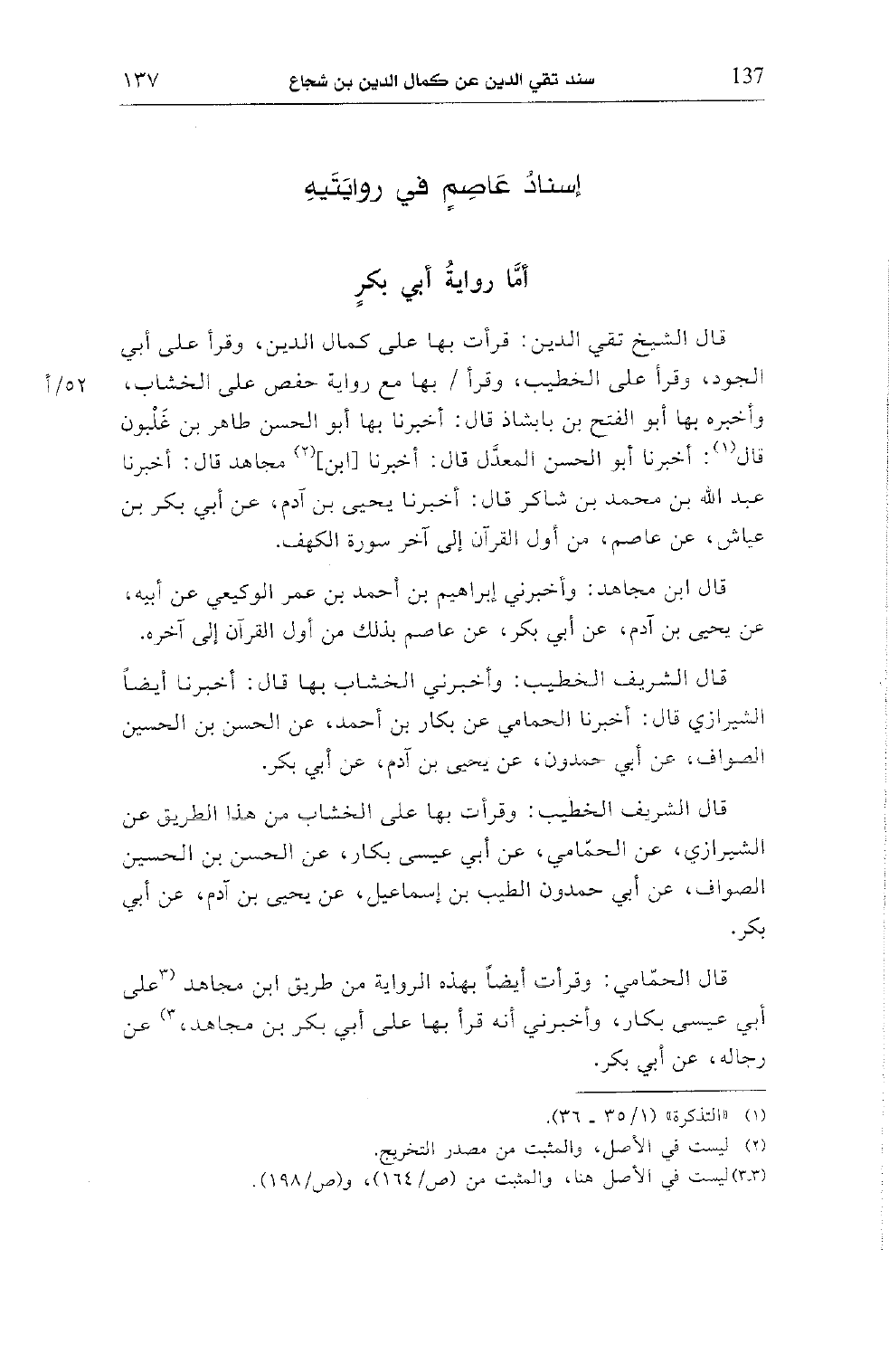 قال الشيخ تقي الدين: قرأت بها على كمال الدين، وقرأ على أبي الجود، وقرأ على الخطيب، وقرأ/ بها مع رواية حفص على الخشاب، وأخبره بها أبو الفتح بن بابشاذ قال: أخبرنا بها أبو الحسن طاهر بن غلبون قال (¬1): أخبرنا أبو الحسن المعدّل قال: أخبرنا [ابن] (¬2) مجاهد قال: أخبرنا عبد الله بن محمد بن شاكر قال: أخبرنا يحيى بن آدم، عن أبي بكر بن عياش، عن عاصم، من أول القرآن إلى آخر سورة الكهف.