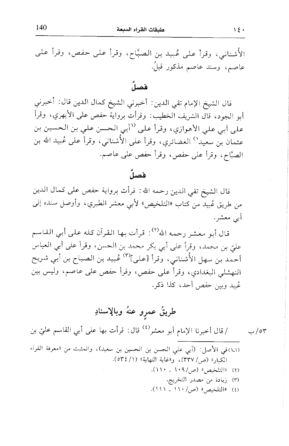 قال الشيخ تقي الدين رحمه الله: قرأت برواية حفص على كمال الدين من طريق عبيد من كتاب «التلخيص» لأبي معشر الطبري، وأوصل سنده إلى أبي معشر.
