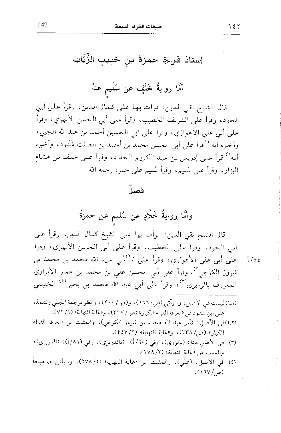 قال الشيخ تقي الدين: قرأت بها على الشيخ كمال الدين، وقرأ على أبي الجود، وقرأ على الخطيب، وقرأ على أبي الحسن الأبهري، وقرأ على أبي علي الأهوازي، وقرأ على/ [أبي عبيد الله محمد بن محمد بن فيروز الكرجي] (¬2)، وقرأ على أبي الحسن علي بن محمد بن عمار الأبزاري المعروف بالزريري (¬3)، وقرأ على أبي عبد الله محمد بن يحيى (¬4) الخنيسي