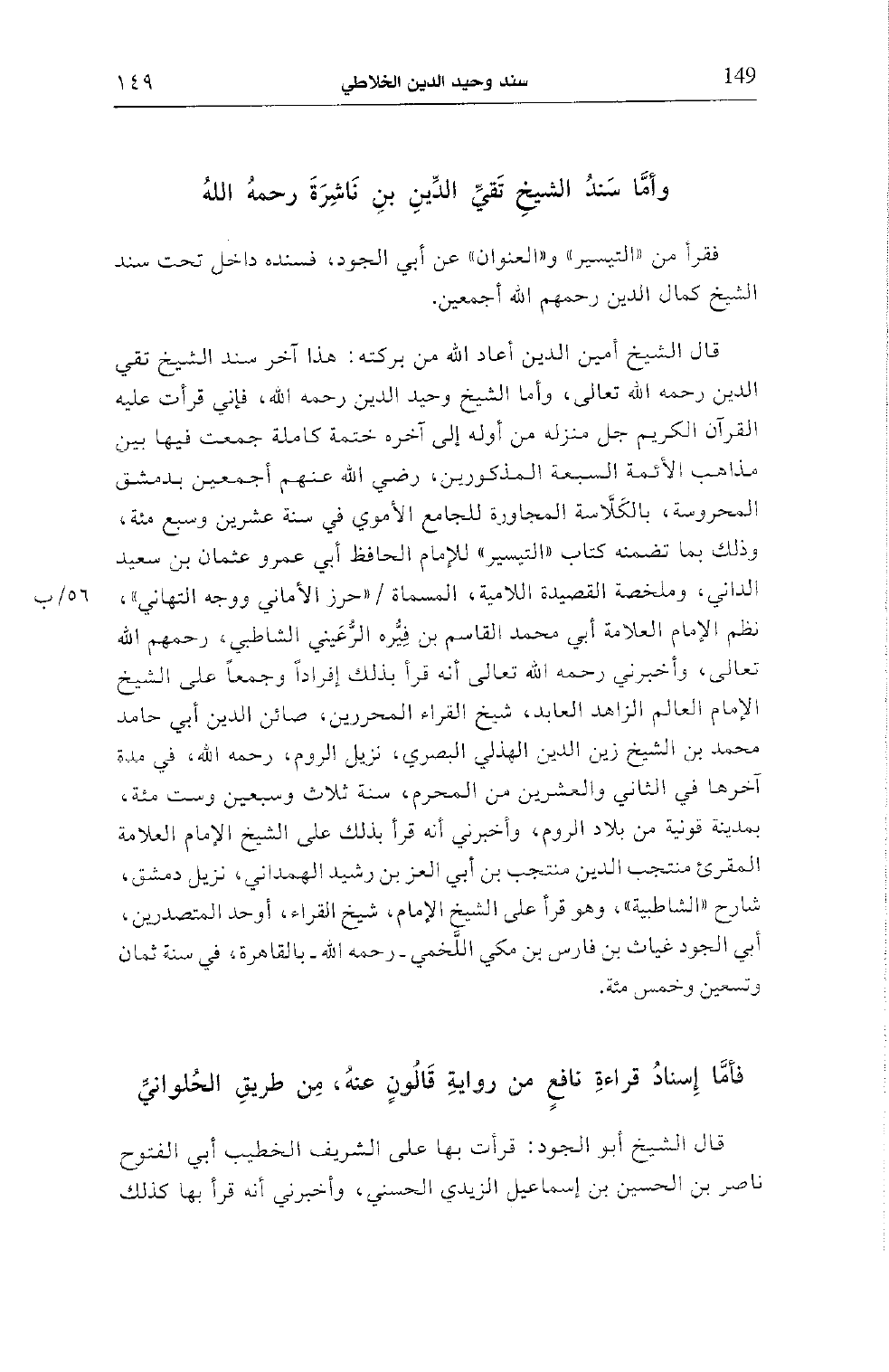 قال الشيخ أمين الدين أعاد الله من بركته: هذا آخر سند الشيخ تقي الدين رحمه الله تعالى، وأما الشيخ وحيد الدين رحمه الله، فإني قرأت عليه القرآن الكريم جل منزله من أوله إلى آخره ختمة كاملة جمعت فيها بين مذاهب الأئمة السبعة المذكورين، رضي الله عنهم أجمعين بدمشق المحروسة، بالكلاسة المجاورة للجامع الأموي في سنة عشرين وسبع مائة، وذلك بما تضمنه كتاب «التيسير» للإمام الحافظ أبي عمرو عثمان بن سعيد الداني، وملخصة القصيدة اللامية، المسماة/ «حرز الأماني ووجه التهاني»، نظم الإمام العلامة أبي محمد القاسم بن فيّره الرّعيني الشاطبي، رحمهم الله تعالى، وأخبرني رحمه الله تعالى أنه قرأ بذلك إفرادا وجمعا على الشيخ الإمام العالم الزاهد العابد، شيخ القراء المحررين، صائن الدين أبي حامد محمد بن الشيخ زين الدين الهذلي البصري، نزيل الروم، رحمه الله، في مدة آخرها في الثاني والعشرين من المحرم، سنة ثلاث وسبعين وست مائة، بمدينة قونية من بلاد الروم، وأخبرني أنه قرأ بذلك على الشيخ الإمام العلامة المقرئ منتجب الدين منتجب بن أبي العز بن رشيد الهمداني، نزيل دمشق، شارح «الشاطبية»، وهو قرأ على الشيخ الإمام، شيخ القراء، أوحد المتصدرين، أبي الجود غياث بن فارس بن مكي اللّخمي- رحمه الله- بالقاهرة، في سنة ثمان وتسعين وخمس مائة.