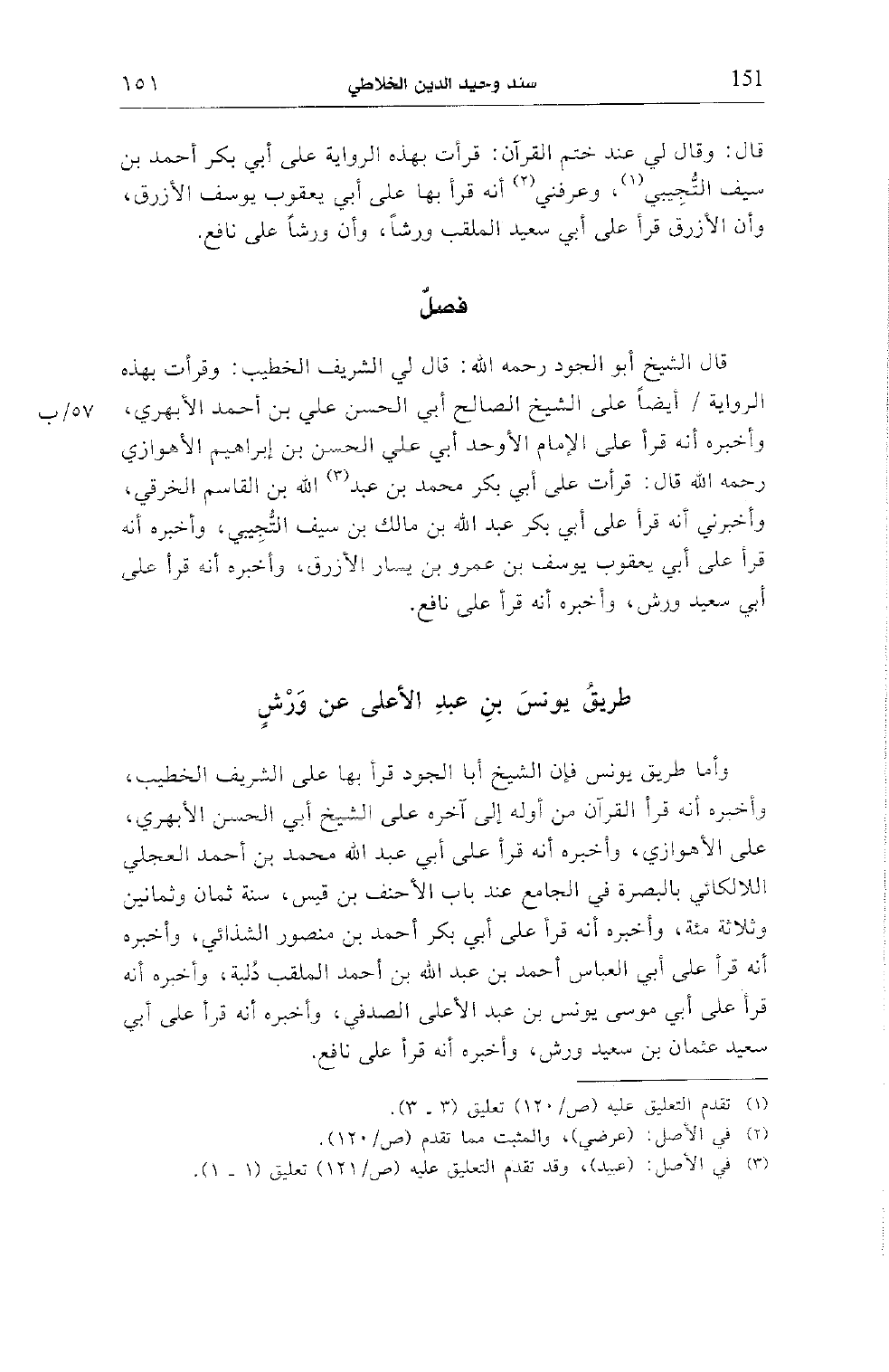 وأما طريق يونس فإن الشيخ أبا الجود قرأ بها على الشريف الخطيب، وأخبره أنه قرأ القرآن من أوله إلى آخره على الشيخ أبي الحسن الأبهري، على الأهوازي، وأخبره أنه قرأ على أبي عبد الله محمد بن أحمد العجلي اللالكائي بالبصرة في الجامع عند باب الأحنف بن قيس، سنة ثمان وثمانين وثلاثة مائة، وأخبره أنه قرأ على أبي بكر أحمد بن منصور الشذائي، وأخبره أنه قرأ على أبي العباس أحمد بن عبد الله بن أحمد الملقب دلبة، وأخبره أنه قرأ على أبي موسى يونس بن عبد الأعلى الصدفي، وأخبره أنه قرأ على أبي سعيد عثمان بن سعيد ورش، وأخبره أنه قرأ على نافع.