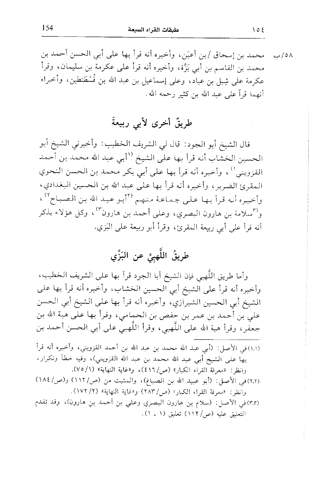 قال الشيخ أبو الجود: قال لي الشريف الخطيب: وأخبرني الشيخ أبو الحسين الخشاب أنه قرأ بها على الشيخ [أبي عبد الله محمد بن أحمد القزويني] (¬1)، وأخبره أنه قرأ بها على أبي بكر محمد بن الحسن النحوي المقرئ الضرير، وأخبره أنه قرأ بها على عبد الله بن الحسين البغدادي، وأخبره أنه قرأ بها على جماعة منهم [أبو عبد الله بن الصباح] (¬2)، و [سلامة بن هارون البصري، وعلى أحمد بن هارون] (¬3)، وكل هؤلاء يذكر أنه قرأ على أبي ربيعة المقرئ، وقرأ أبو ربيعة على البزي.