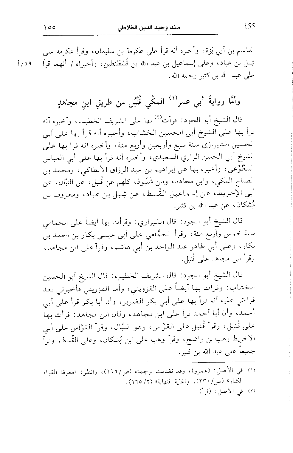 قال الشيخ أبو الجود: قرأت (¬2) بها على الشريف الخطيب، وأخبره أنه قرأ بها على الشيخ أبي الحسين الخشاب، وأخبره أنه قرأ بها على أبي الحسين الشيرازي سنة سبع وأربعين وأربع مائة، وأخبره أنه قرأ بها على الشيخ أبي الحسن الرازي السعيدي، وأخبره أنه قرأ بها على أبي العباس المطّوّعي، وأخبره بها عن إبراهيم بن عبد الرزاق الأنطاكي، ومحمد بن الصباح المكي، وابن مجاهد، وابن شنبوذ، كلهم عن قنبل، عن النبّال، عن أبي الإخريط، عن إسماعيل القسط، عن شبل بن عباد، ومعروف بن مشكان، عن عبد الله بن كثير.