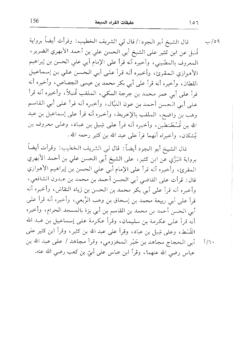 قال الشيخ أبو الجود أيضا: قال لي الشريف الخطيب: وقرأت أيضا برواية البزّي عن ابن كثير، على الشيخ أبي الحسن علي بن أحمد الأبهري المقرئ، وأخبره أنه قرأ على الإمام أبي علي الحسن بن إبراهيم الأهوازي قال: قرأت على القاضي أبي الحسن أحمد بن محمد بن عبدون الشافعي، وأخبره أنه قرأ على أبي بكر محمد بن الحسن بن زياد النقاش، وأخبره أنه قرأ على أبي ربيعة محمد بن إسحاق بن وهب الرّبعي، وأخبره أنه قرأ على أبي الحسن أحمد بن محمد بن القاسم بن أبي بزة بالمسجد الحرام، وأخبره أنه قرأ على عكرمة بن سليمان، وقرأ عكرمة على إسماعيل بن عبد الله القسط، وعلى شبل بن عباد، وقرأ على عبد الله بن كثير، وقرأ ابن كثير على أبي الحجاج مجاهد بن جبر المخزومي، وقرأ مجاهد/ على عبد الله بن عباس رضي الله عنهما، وقرأ ابن عباس على أبيّ بن كعب رضي الله عنه.