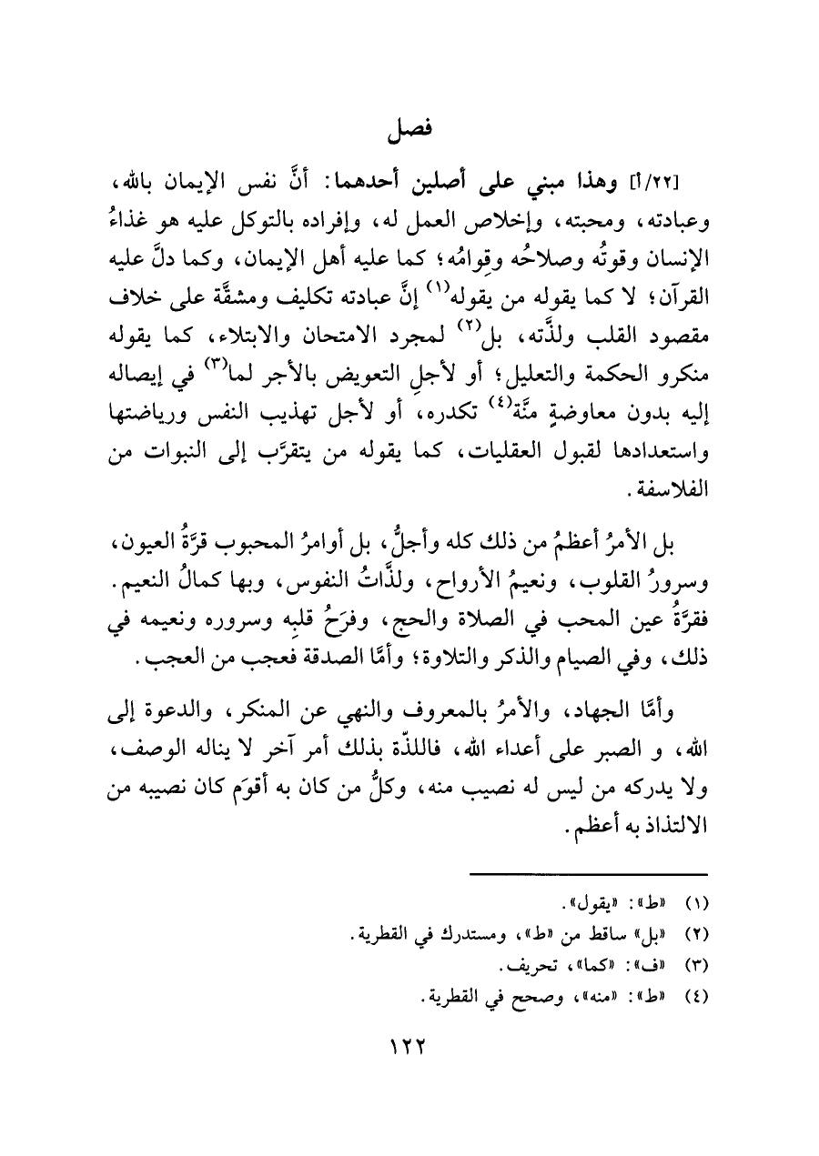 وهذا مبني على أصلين أحدهما: أنَّ نفس الإيمان باللَّه، وعبادته، ومحبته، وإخلاص العمل له، وإفراده بالتوكل عليه هو غذاءُ الإنسان وقوتُه وصلاحُه وقِوامُه؛ كما عليه أهل الإيمان، وكما دلَّ عليه القرآن؛ لا كما يقوله من يقوله (¬١) إن عبادته تكليف ومشقة على خلاف مقصود القلب ولذَّته، بل (¬٢) لمجرد الامتحان والابتلاء، كما يقوله منكرو الحكمة والتعليل؛ أو لأجلِ التعويض بالأجر لما (¬٣) في إيصاله إليه بدون معاوضةٍ منَّة (¬٤) تكدره، أو لأجل تهذيب النفس ورياضتها واستعدادها لقبول العقليات، كما يقوله من يتقرَّب إلى النبوات من الفلاسفة.