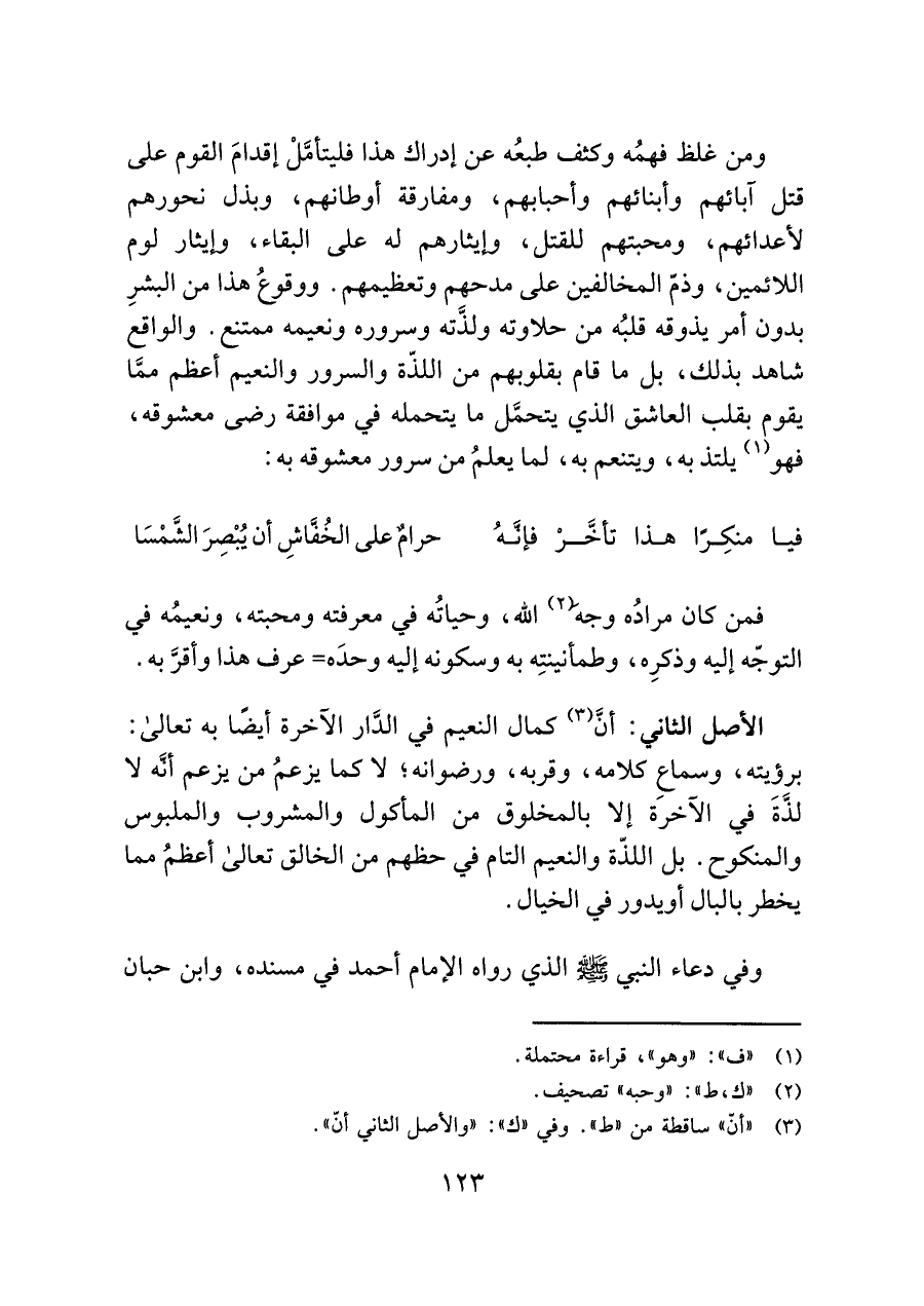 الأصل الثاني: أنَّ (¬٣) كمال النعيم في الدَّار الآخرة أيضًا به تعالى: برؤيته، وسماع كلامه، وقربه، ورضوانه؛ لا كما يزعمُ من يزعم أنه لا لذَّةَ في الآخرَة إلا بالمخلوق من المأكول والمشروب والملبوس والمنكوح. بل اللذة والنعيم التام في حظهم من الخالق تعالى أعظمُ مما يخطر بالبال أو يدور في الخيال.