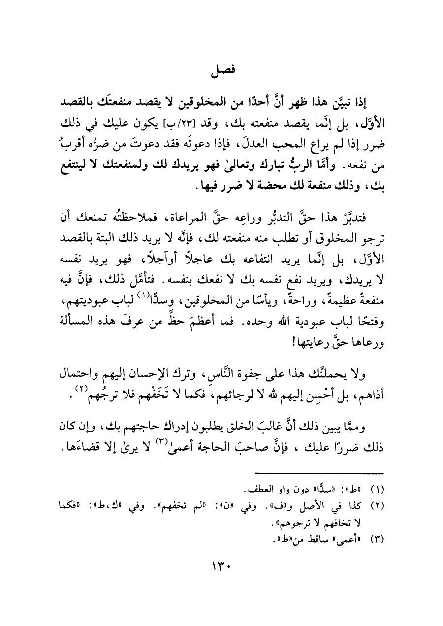 فتدبَّرْ هذا حقَّ التدبُّر وراعِه حق المراعاة، فملاحظتُه تمنعك أن ترجو المخلوق أو تطلب منه منفعته لك، فإنَّه لا يريد ذلك البتة بالقصد الأوَّل، بل إنما يريد انتفاعه بك عاجلًا أو آجلًا، فهو يريد نفسه لا يريدك، ويريد نفع نفسه بك لا نفعك بنفسه. فتأمَّل ذلك، فإنَّ فيه منفعةً عظيمةً، وراحة، ويأشا من المخلوقين، وسدًّا (¬١) لباب عبوديتهم، وفتحًا لباب عبودية اللَّه وحده. فما أعظمَ حظَّ من عرفَ هذه المسألة ورعاها حقَّ رعايتها!