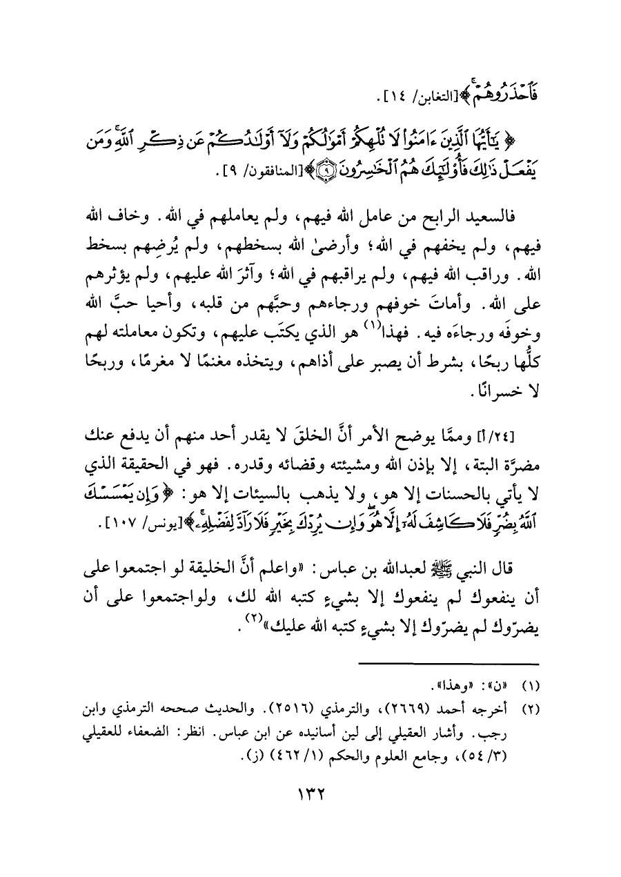 قال النبي -صلى اللَّه عليه وسلم- لعبد اللَّه بن عباس: "واعلم أنَّ الخليقة لو اجتمعوا على أن ينفعوك لم ينفعوك إلا بشيءٍ كتبه اللَّه لك، ولو اجتمعوا على أن يضرّوك لم يضروك إلا بشيءٍ كتبه اللَّه عليك" (¬٢).