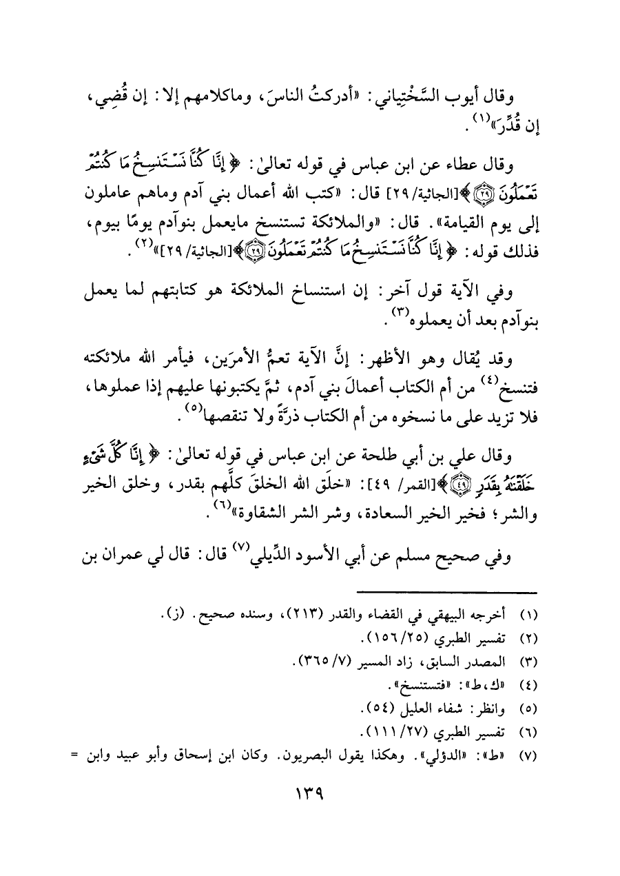 وقال عطاء عن ابن عباس في قوله تعالى: {إِنَّا كُنَّا نَسْتَنْسِخُ مَا كُنْتُمْ تَعْمَلُونَ (٢٩)} [الجاثية/ ٢٩] قال: "كتب اللَّه أعمال بني آدم وما هم عاملون إلى يوم القيامة". قال: "والملائكة تستنسخ ما يعمل بنو آدم يومًا بيوم، فذلك قوله: {إِنَّا كُنَّا نَسْتَنْسِخُ مَا كُنْتُمْ تَعْمَلُونَ (٢٩)} [الجاثية/ ٢٩] " (¬٢).