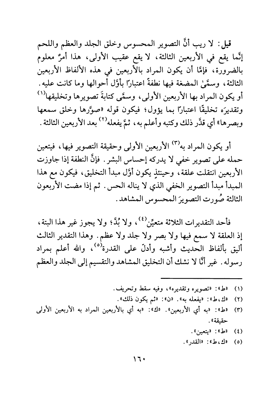 فأحد التقديرات الثلاثة متعيِّن (¬٤)، ولا بُدَّ؛ ولا يجوز غير هذا البتة، إذ العلقة لا سمع فيها ولا بصر ولا جلد ولا عظم. وهذا التقدير الثالث أليق بألفاظ الحديث وأشبه وأدل على القدرة (¬٥)، واللَّه أعلم بمراد رسوله. غير أنَّا لا نشك أن التخليق المشاهد والتقسيم إلى الجلد والعظم