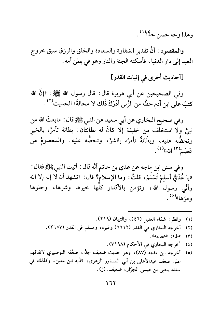 وفي سنن ابن ماجه عن عدي بن حاتم أنَّه قال: أتيت النبي -صلى اللَّه عليه وسلم- فقال: "يا عُدَيُّ أسلِمْ تَسْلَمْ، قلتُ: وما الإسلام؟ قال: "تشهد أن لا إله إلا اللَّه وأنِّي رسول اللَّه، وتؤمن بالأقدار كلها خيرها وشرها، وحلوها ومرّها" (¬٥).