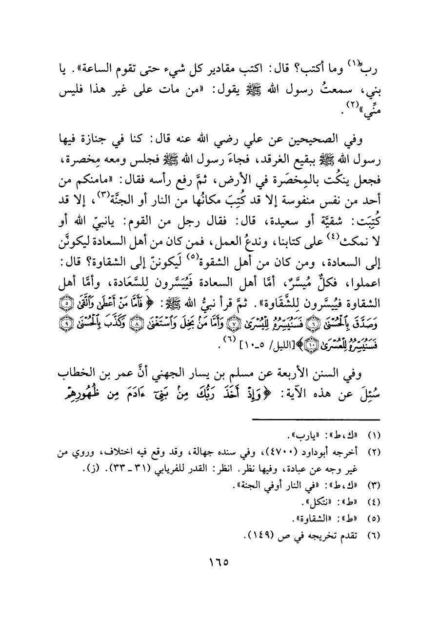 وفي الصحيحين عن علي رضي اللَّه عنه قال: كنا في جنازة فيها رسول اللَّه -صلى اللَّه عليه وسلم- ببقيع الغرقد، فجاءَ رسول اللَّه -صلى اللَّه عليه وسلم- فجلس ومعه مِخصرة، فجعل ينكُت بالمِخصَرة في الأرض، ثمَّ رفع رأسه فقال: "ما منكم من أحد من نفس منفوسة إلا قد كُتِبَ مكانُها من النار أو الجنَّة (¬٣)، إلا قد كُتِبَت: شقيَّة أو سعيدة، قال: فقال رجل من القوم: يا نبيّ اللَّه أو لا نمكث (¬٤) على كتابنا، وندع العمل، فمن كان من أهل السعادة ليكونَّن إلى السعادة، ومن كان من أهل الشقوة (¬٥) لَيكوننّ إلى الشقاوة؟ قال: اعملوا، فكل مُيسَّرٌ، أمَّا أهل السعادة فَيُيَسَّرون لِلسَّعَادة، وأمَّا أهل الشقاوة فيُيسَّرون لِلشَّقَاوة". ثمَّ قرأ نبيُّ اللَّه -صلى اللَّه عليه وسلم-: {فَأَمَّا مَنْ أَعْطَى وَاتَّقَى (٥) وَصَدَّقَ بِالْحُسْنَى (٦) فَسَنُيَسِّرُهُ لِلْيُسْرَى (٧) وَأَمَّا مَنْ بَخِلَ وَاسْتَغْنَى (٨) وَكَذَّبَ بِالْحُسْنَى (٩) فَسَنُيَسِّرُهُ لِلْعُسْرَى (١٠)} [الليل/ ٥ - ١٠] (¬٦).