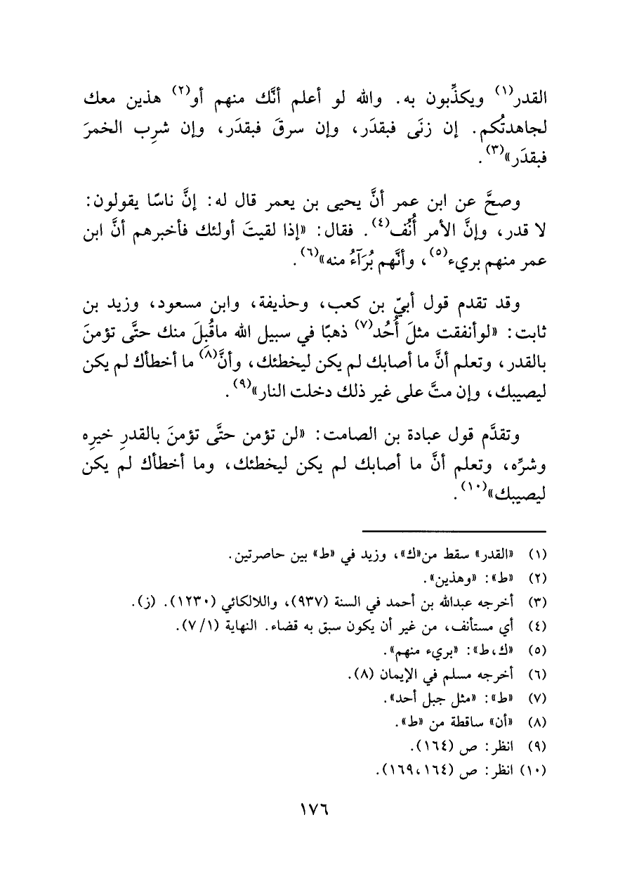 وتقدَّم قول عبادة بن الصامت: "لن تؤمن حتَّى تؤمنَ بالقدرِ خيرِه وشرِّه، وتعلم أنَّ ما أصابك لم يكن ليخطئك، وما أخطاك لم يكن ليصيبك" (¬١٠).