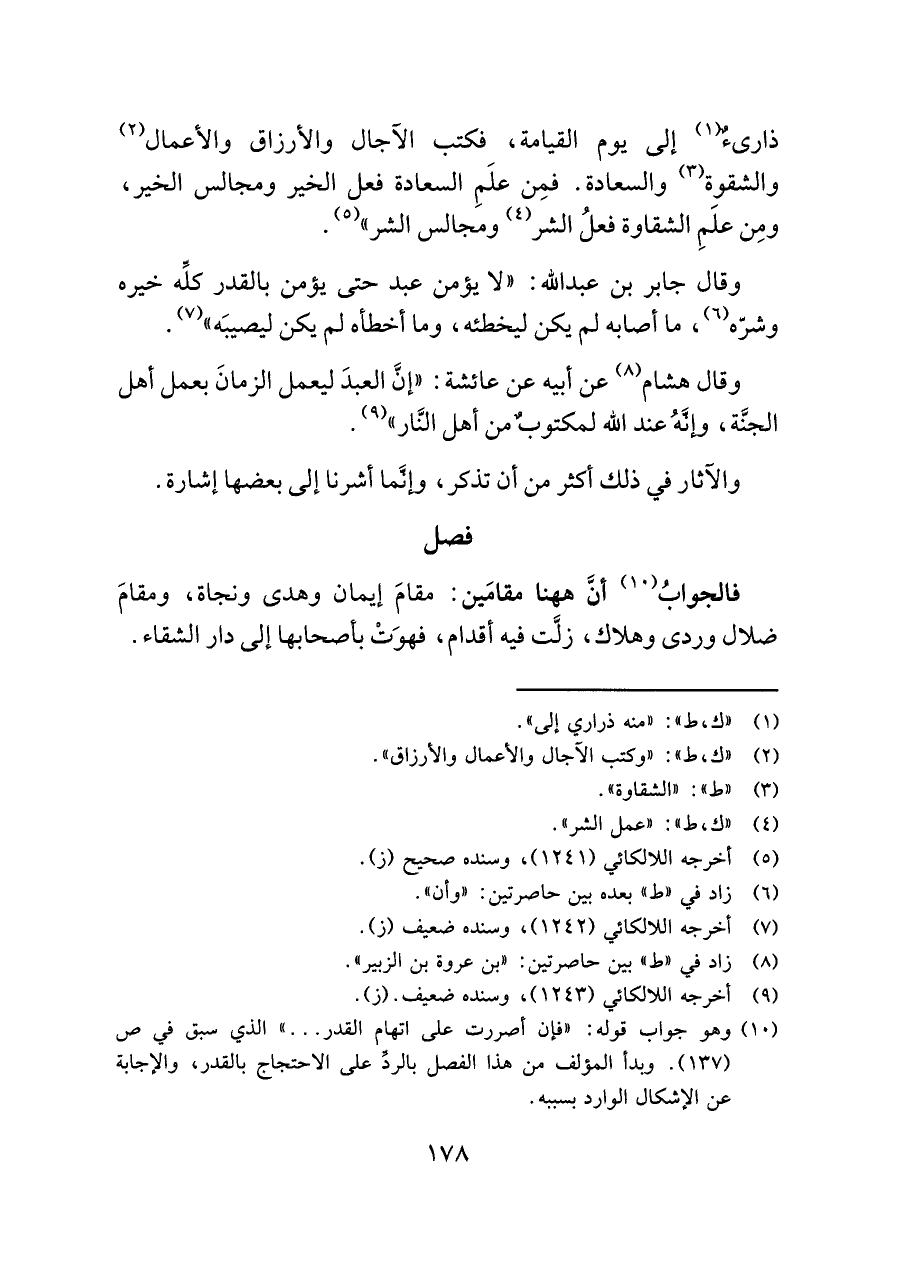 (¬١٠) وهو جواب قوله: "فإن أصررت على اتهام القدر. . . " الذي سبق في ص (١٣٧). وبدأ المؤلف من هذا الفصل بالرد على الاحتجاج بالقدر، والإجابة عن الإشكال الوارد بسببه.
