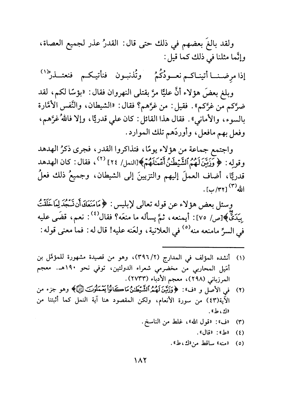وسئل بعض هؤلاء عن قوله تعالى لإبليس: {مَا مَنَعَكَ أَنْ تَسْجُدَ لِمَا خَلَقْتُ بِيَدَيَّ} [ص/ ٧٥]: أيمنعه، ثمَّ يسأله ما منعَه؟ فقال (¬٤): نعم، قضَى عليه في السرِّ ما منعه منه (¬٥) في العلانية، ولعَنه عليه! قال له: فما معنى قوله: