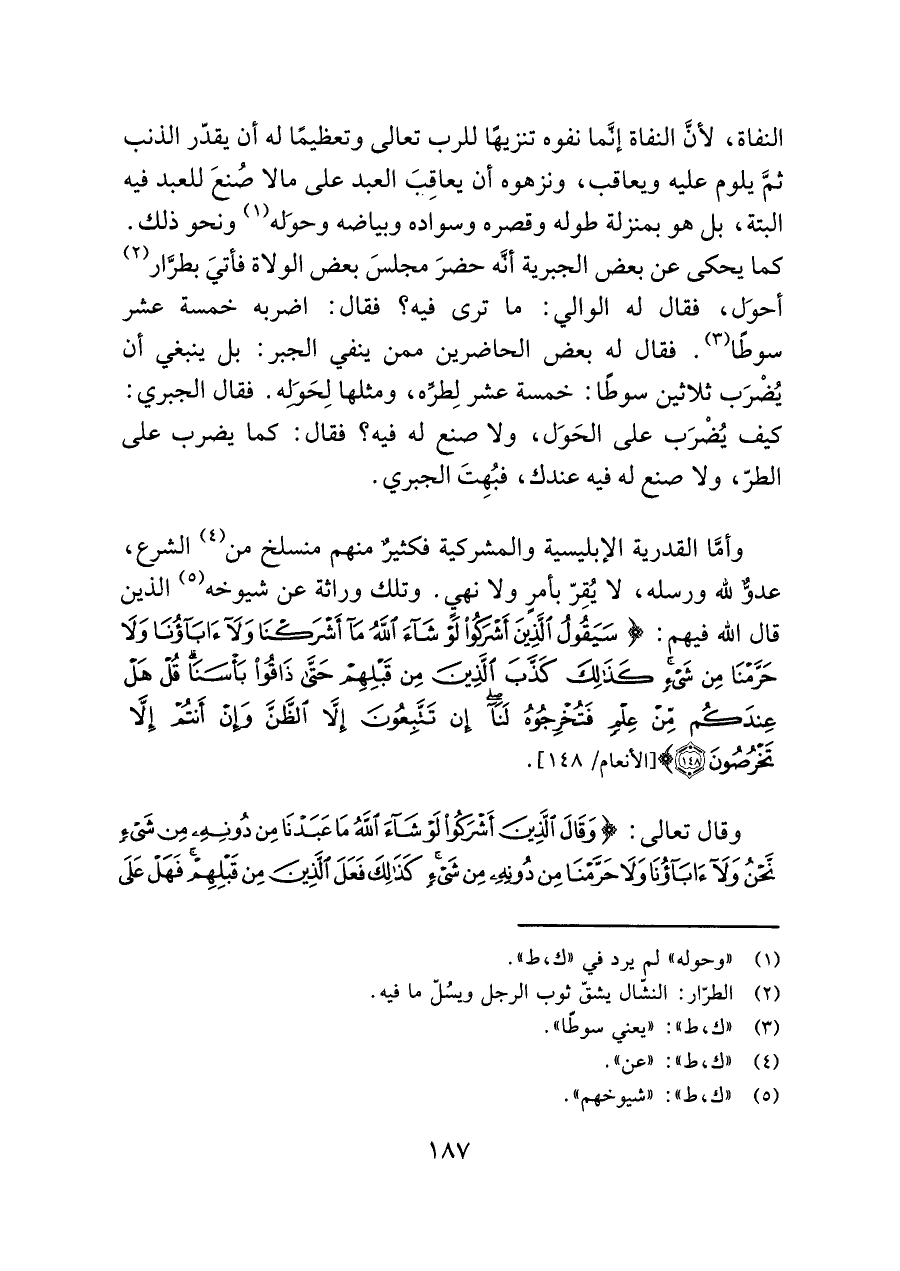 وأمَّا القدرية الإبليسية والمشركية فكثيرٌ منهم منسلخ من (¬٤) الشرع، عدوٌّ للَّه ورسله، لا يُقِرّ بأمرٍ ولا نهي. وتلك وراثة عن شيوخه (¬٥) الذين قال اللَّه فيهم: {سَيَقُولُ الَّذِينَ أَشْرَكُوا لَوْ شَاءَ اللَّهُ مَا أَشْرَكْنَا وَلَا آبَاؤُنَا وَلَا حَرَّمْنَا مِنْ شَيْءٍ كَذَلِكَ كَذَّبَ الَّذِينَ مِنْ قَبْلِهِمْ حَتَّى ذَاقُوا بَأْسَنَا قُلْ هَلْ عِنْدَكُمْ مِنْ عِلْمٍ فَتُخْرِجُوهُ لَنَا إِنْ تَتَّبِعُونَ إِلَّا الظَّنَّ وَإِنْ أَنْتُمْ إِلَّا تَخْرُصُونَ (١٤٨)} [الأنعام/ ١٤٨].