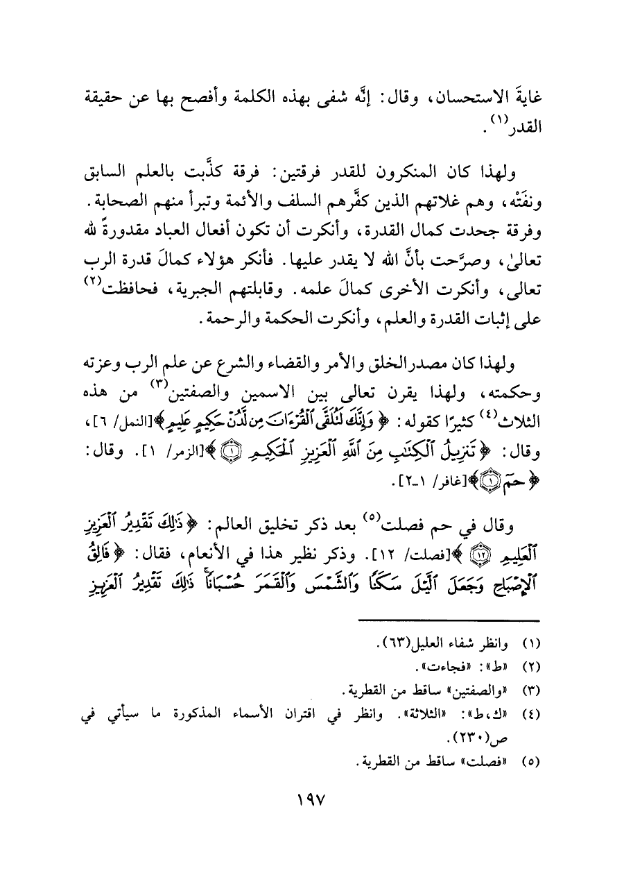 ولهذا كان مصدر الخلق والأمر والقضاء والشرع عن علم الرب وعزته وحكمته، ولهذا يقرن تعالى بين الاسمين والصفتين (¬٣) من هذه الثلاث (¬٤) كثيرًا كقوله: {وَإِنَّكَ لَتُلَقَّى الْقُرْآنَ مِنْ لَدُنْ حَكِيمٍ عَلِيمٍ (٦)} [النمل/ ٦]، وقال: {تَنْزِيلُ الْكِتَابِ مِنَ اللَّهِ الْعَزِيزِ الْحَكِيمِ (١)} [الزمر/ ١]. وقال: {حمَ} [غافر/ ١ - ٢].