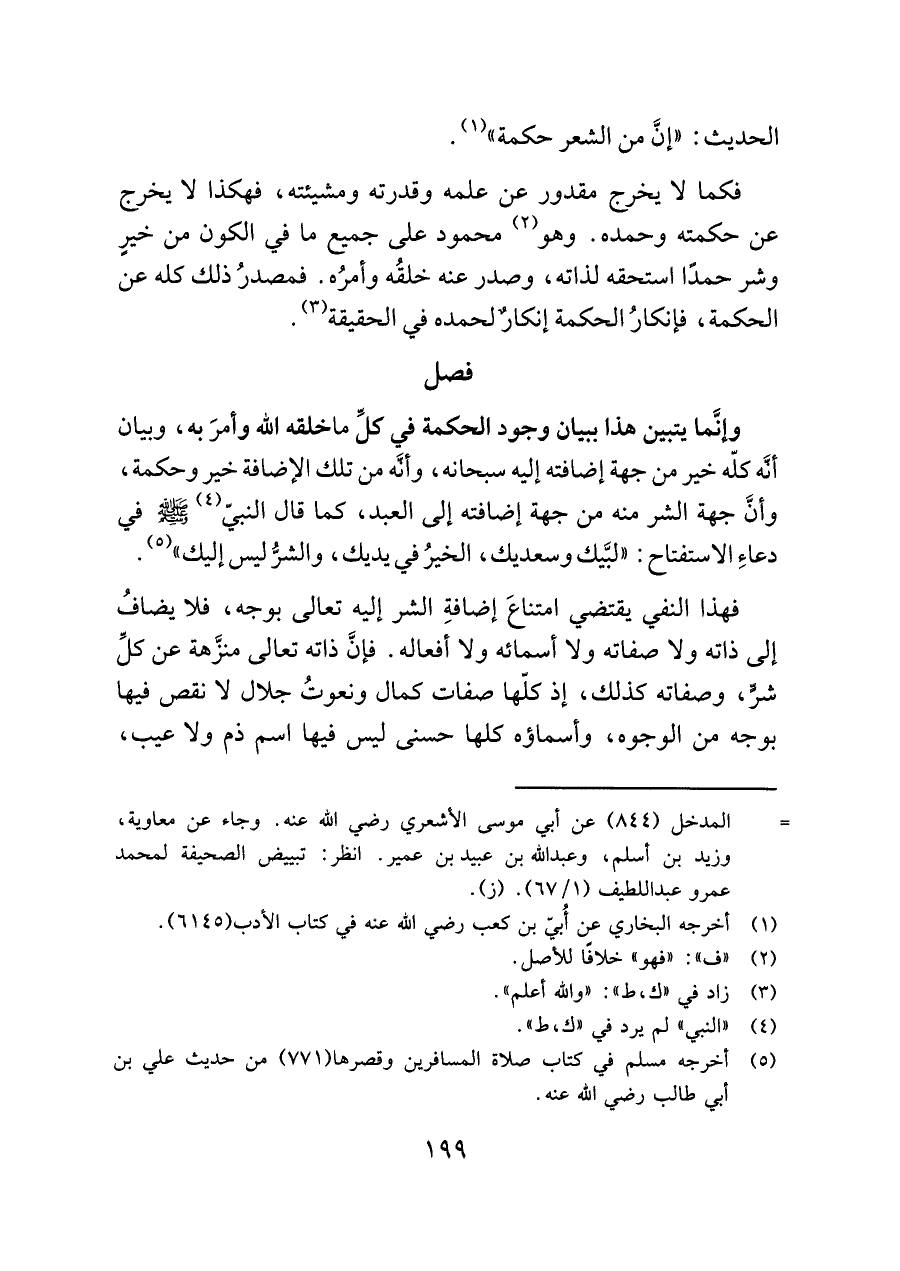 وإنَّما يتبين هذا ببيان وجود الحكمة في كلِّ ما خلقه اللَّه وأمرَ به، وبيان أنَّه كلّه خير من جهة إضافته إليه سبحانه، وأنَّه من تلك الإضافة خير وحكمة، وأنَّ جهة الشر منه من جهة إضافته إلى العبد، كما قال النبيّ (¬٤) -صلى اللَّه عليه وسلم- في دعاءِ الاستفتاح: "لبَّيك وسعديك، الخيرُ في يديك، والشرُّ ليس إليك" (¬٥).