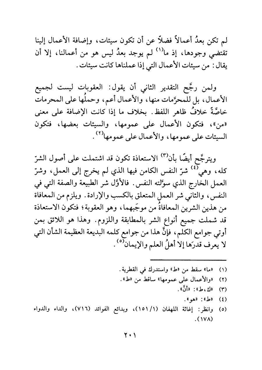 ولمن رجَّح التقدير الثاني أن يقول: العقوبات ليست لجميع الأعمال، بل للمحرَّمات منها، والأعمال أعم، وحملُها على المحرمات خاضَةً خلافُ ظاهر اللفظ. بخلاف ما إذا كانت الإضافة على معنى "من"، فتكون الأعمال على عمومها، والسيئات بعضها، فتكون السيئات على عمومها، والأعمال على عمومها (¬٢).