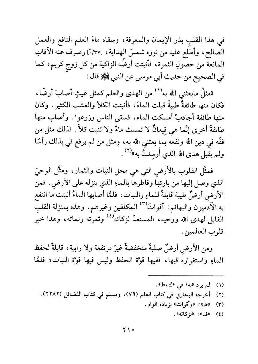 "مثلُ ما بعثني اللَّه به (¬١) من الهدى والعلم كمثل غيثٍ أصابَ أرضًا، فكان منها طائفةٌ طيبةٌ قبلت الماءَ، فأنبتت الكلأ والعشب الكثير. وكان منها طائفة أجادبُ أمسكت الماء، فسقى الناس وزرعوا. وأصاب منها طائفةً أخرى إنَّما هي قِيعانٌ لا تمسك ماءً ولا تنبت كلأ. فذلك مثل من فقُه في دين اللَّه ونفعه بما بعثني اللَّه به، ومثل من لم يرفع في بذلك رأسًا ولم يقبل هدى اللَّه الذي أُرسِلتُ به" (¬٢).