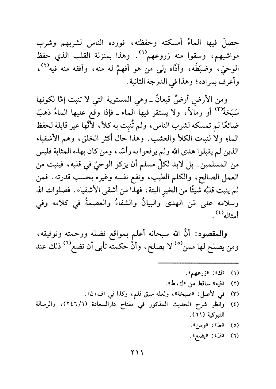 ومن الأرضِ أرضٌ قيعانٌ -وهي المستوية التي لا تنبت إمَّا لكونها سَبَخةً (¬٣) أو رمالًا، ولا يستقر فيها الماء- فإذا وقع عليها الماءُ ذهبَ ضائعًا لم تمسكه لشرب الناس، ولم تُنبت به كلأ، لأنَّها غير قابلة لحفظ الماءِ ولا لنبات الكلأ والعشب. وهذَا حال أكثر الخلق، وهم الأشقياء الذين لم يقبلوا هدى اللَّه ولم يرفعوا به رأسًا، ومن كان بهذه المثابة فليس من المسلمين. بل لابد لكلِّ مسلم أن يزكو الوحيُ في قلبه، فينبت من العمل الصالح، والكلم الطيب، ونفع نفسه وغيره بحسب قدرته. فمن لم ينبت قلبُه شيئًا من الخيرِ البتة، فهذا من أشقى الأشقياء. فصلوات اللَّه وسلامه على مَن الهدى والبيانُ والشفاءُ والعصمةُ في كلامه وفي أمثاله (¬٤).