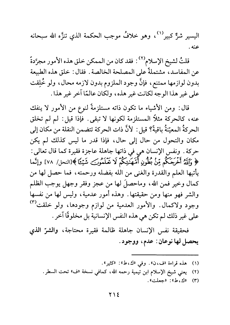 قال: ومن الأشياء ما تكون ذاته مستلزمةً لنوع من الأمور لا ينفك عنه، كالحركة مثلًا المستلزمة لكونها لا تبقى. فإذا قيل: لم لم تخلق الحركةُ المعيّنةُ باقيةً؟ قيل: لأنَّ ذات الحركة تتضمن النقلة من مكان إلى مكان والتحول من حال إلى حال، فإذا قدر ما ليس كذلك لم يكن حركة. ونفس الإنسان هي في ذاتها جاهلة عاجزة فقيرة كما قال تعالى: {وَاللَّهُ أَخْرَجَكُمْ مِنْ بُطُونِ أُمَّهَاتِكُمْ لَا تَعْلَمُونَ شَيْئًا} [النحل/ ٧٨] وإنَّما يأتيها العلم والقدرة والغنى من اللَّه بفضله ورحمته، فما حصل لها من كمال وخير فمن اللَّه، وماحصلَ لها من عجز وفقر وجهل يوجب الظلم والشر فهو منها ومن حقيقتها. وهذه أمور عدمية، وليس لها من نفسها وجود ولا كمال. والأمور العدمية من لوازم وجودها، ولو خلقت (¬٣) على غير ذلك لم تكن هي هذه النفس الإنسانية بل مخلوقًا آخر.