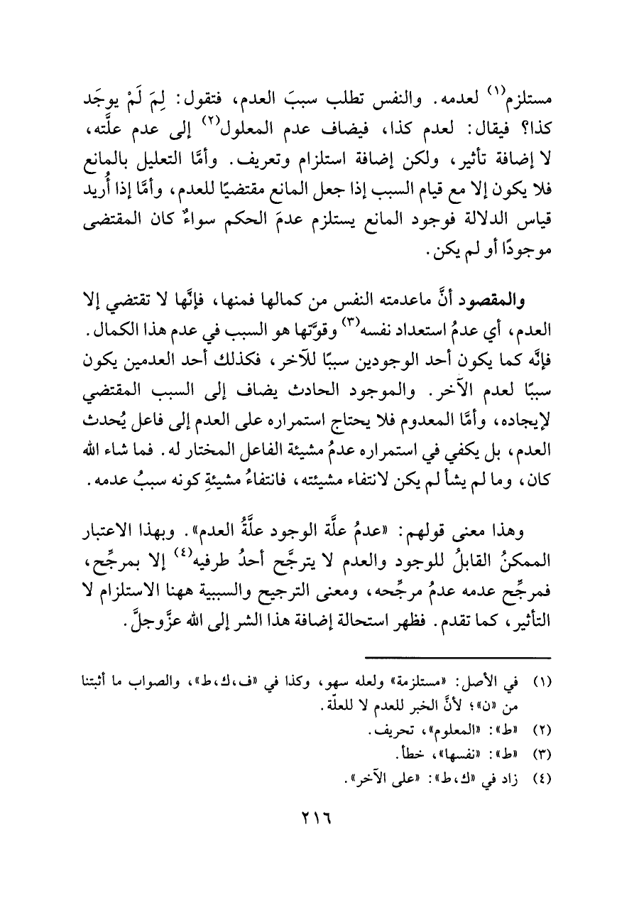 والمقصود أنَّ ما عدمته النفس من كمالها فمنها، فإنَّها لا تقتضي إلا العدم، أي عدمُ استعداد نفسه (¬٣) وقوَّتَها هو السبب في عدم هذا الكمال. فإنَّه كما يكون أحد الوجودين سببًا للآخر، فكذلك أحد العدمين يكون سببًا لعدم الآخر. والموجود الحادث يضاف إلى السبب المقتضي لإيجاده، وأمَّا المعدوم فلا يحتاج استمراره على العدم إلى فاعل يُحدث العدم، بل يكفي في استمراره عدمُ مشيئة الفاعل المختار له. فما شاء اللَّه كان، وما لم يشأ لم يكن لانتفاء مشيئته، فانتفاءُ مشيئةِ كونه سببُ عدمه.