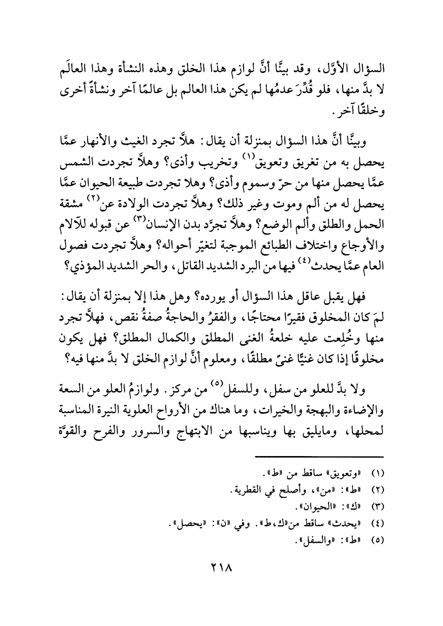 السؤال الأوَّل، وقد بينَّا أنَّ لوازم هذا الخلق وهذه النشأة وهذا العالَم لا بدَّ منها، فلو قُدِّرَ عدمُها لم يكن هذا العالم بل عالمًا آخر ونشأةً أخرى وخلقًا آخر.