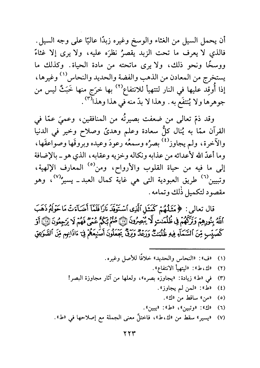 أن يحمل السيل من الغثاء والوسخ وغيره زبدًا عاليًا على وجه السيل. فالذي لا يعرف ما تحت الزبد يقصرُ نظرَه عليه، ولا يرى إلا غثاءً ووسخًا ونحو ذلك، ولا يرى ما تحته من مادة الحياة. وكذلك ما يستخرج من المعادن من الذهب والفضة والحديد والنحاس (¬١) وغيرها، إذا أُوقِد عليها في النار لتتهيأ للانتفاع (¬٢) بها خرَج منها خَبَثٌ ليس من جوهرها ولا يُنتفَع به. وهذا لا بدَّ منه في هذا وهذا (¬٣).