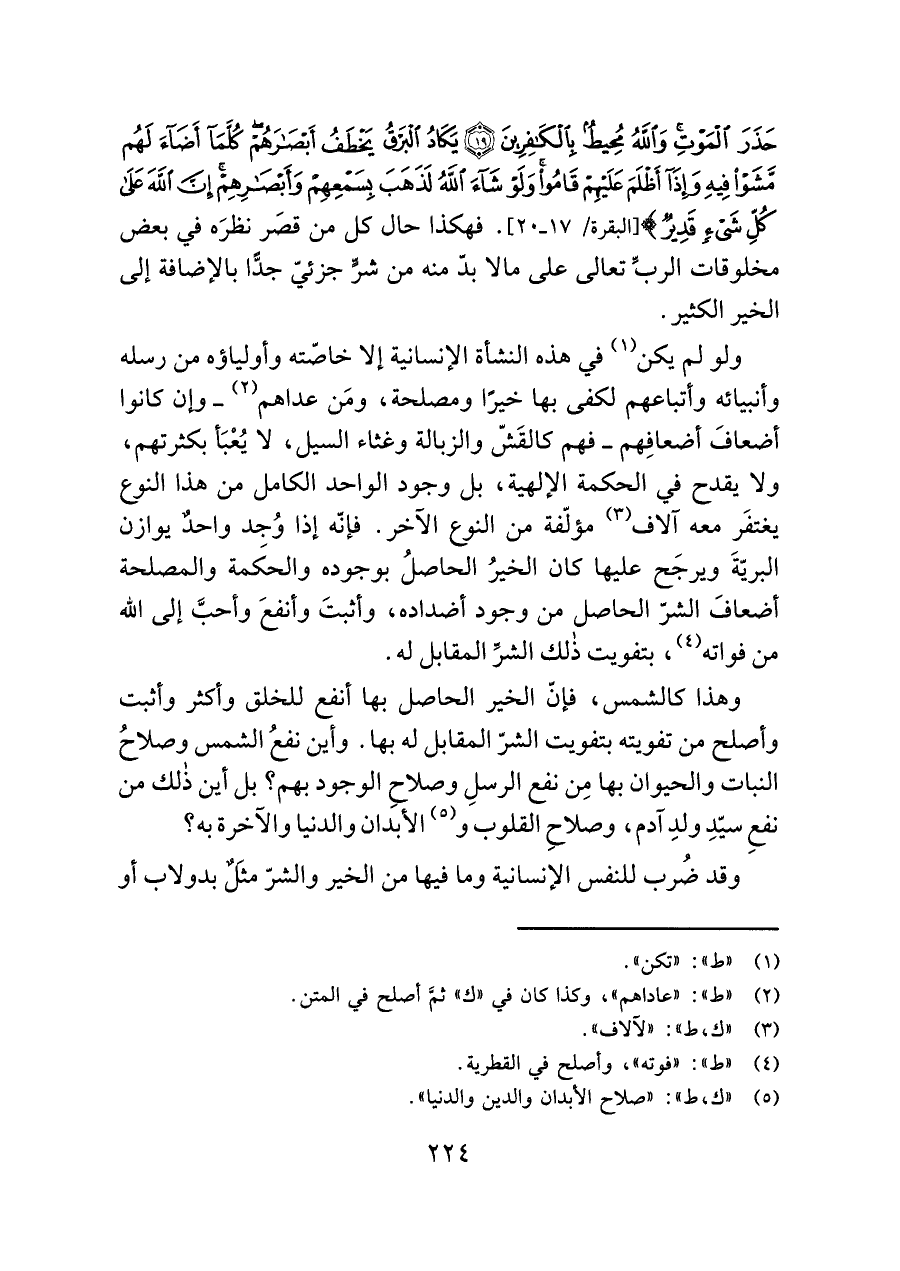 حَذَرَ الْمَوْتِ وَاللَّهُ مُحِيطٌ بِالْكَافِرِينَ (١٩) يَكَادُ الْبَرْقُ يَخْطَفُ أَبْصَارَهُمْ كُلَّمَا أَضَاءَ لَهُمْ مَشَوْا فِيهِ وَإِذَا أَظْلَمَ عَلَيْهِمْ قَامُوا وَلَوْ شَاءَ اللَّهُ لَذَهَبَ بِسَمْعِهِمْ وَأَبْصَارِهِمْ إِنَّ اللَّهَ عَلَى كُلِّ شَيْءٍ قَدِيرٌ (٢٠)} [البقرة/ ١٧ - ٢٠]. فهكذا حال كل من قصَر نظرَه في بعض مخلوقات الربِّ تعالى على ما لابدّ منه من شرٍّ جزئيّ جدًّا بالإضافة إلى الخير الكثير.