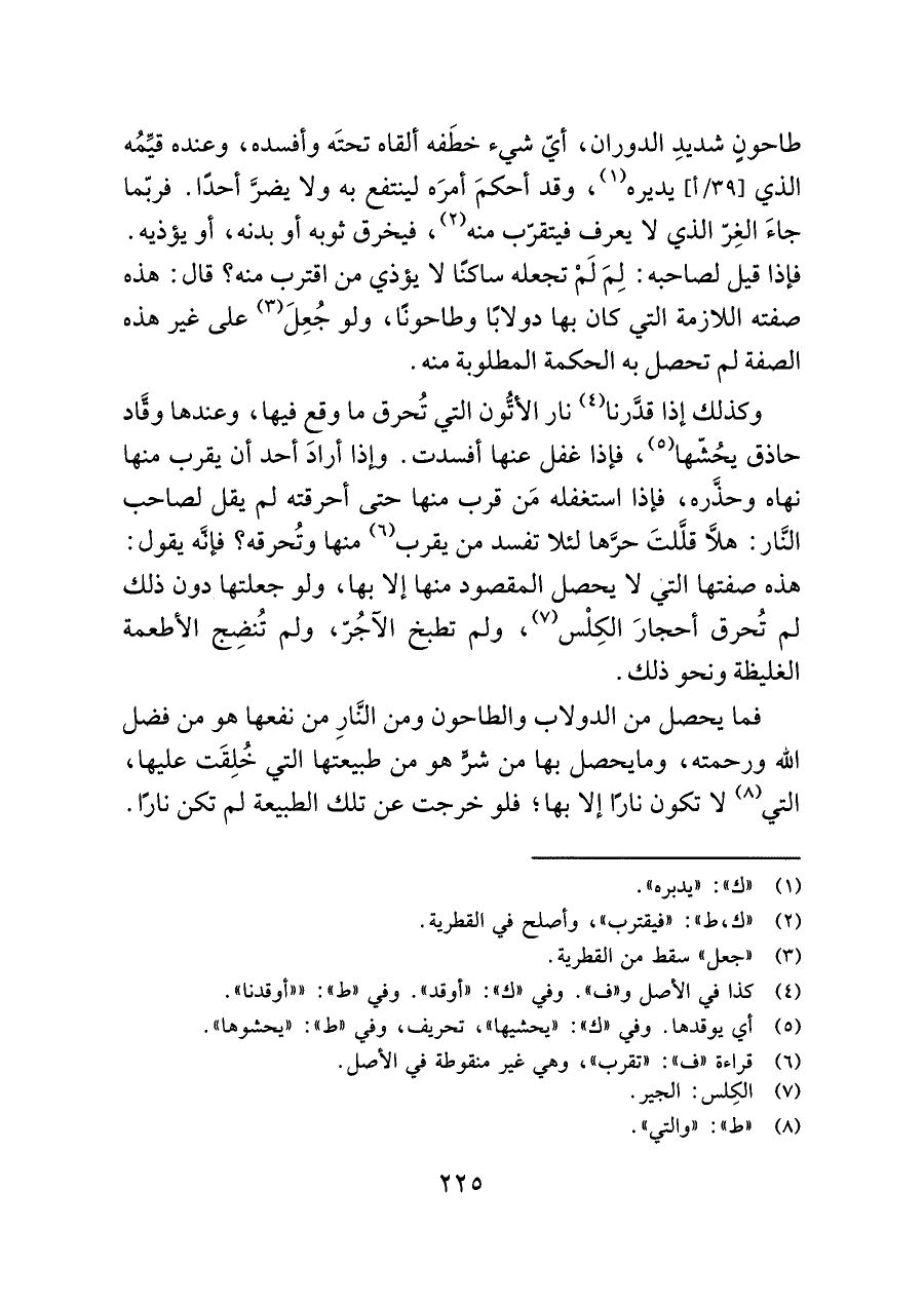طاحونٍ شديدِ الدوران، أيّ شيء خطَفه ألقاه تحتَه وأفسده، وعنده قيِّمُه الَّذي يديره (¬١)، وقد أحكمَ أمرَه لينتفع به ولا يضرَّ أحدًا. فربّما جاءَ الغِرّ الَّذي لا يعرف فيتقرّب منه (¬٢)، فيخرق ثوبه أو بدنه، أو يؤذيه. فإذا قيل لصاحبه: لِمَ لَمْ تجعله ساكنًا لا يؤذي من اقترب منه؟ قال: هذه صفته اللازمة التي كان بها دولابًا وطاحونًا، ولو جُعِلَ (¬٣) على غير هذه الصفة لم تحصل به الحكمة المطلوبة منه.