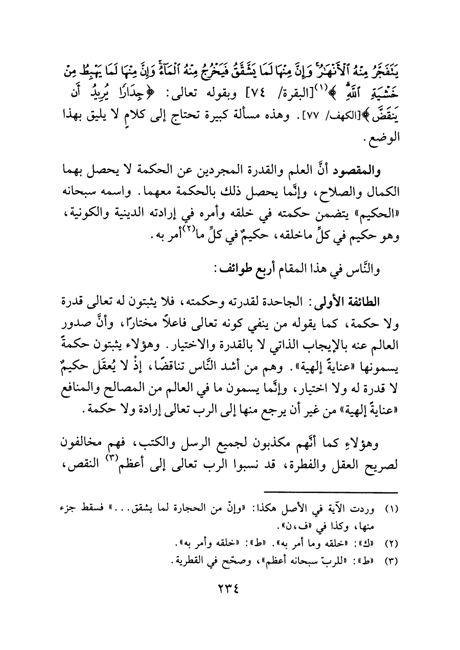 الطائفة الأُولى: الجاحدة لقدرته وحكمته، فلا يثبتون له تعالى قدرة ولا حكمة، كما يقوله من ينفي كونه تعالى فاعلًا مختارًا، وأن صدور العالم عنه بالإيجاب الذاتي لا بالقدرة والاختيار. وهؤلاء يثبتون حكمة يسمونها "عناية إلهية". وهم من أشد النَّاس تناقضًا، إذْ لا يُعقَل حكيمٌ لا قدرة له ولا اختيار، وإنَّما يسمون ما في العالم من المصالح والمنافع "عناية إلهية" من غير أن يرجع منها إلى الرب تعالى إرادة ولا حكمة.