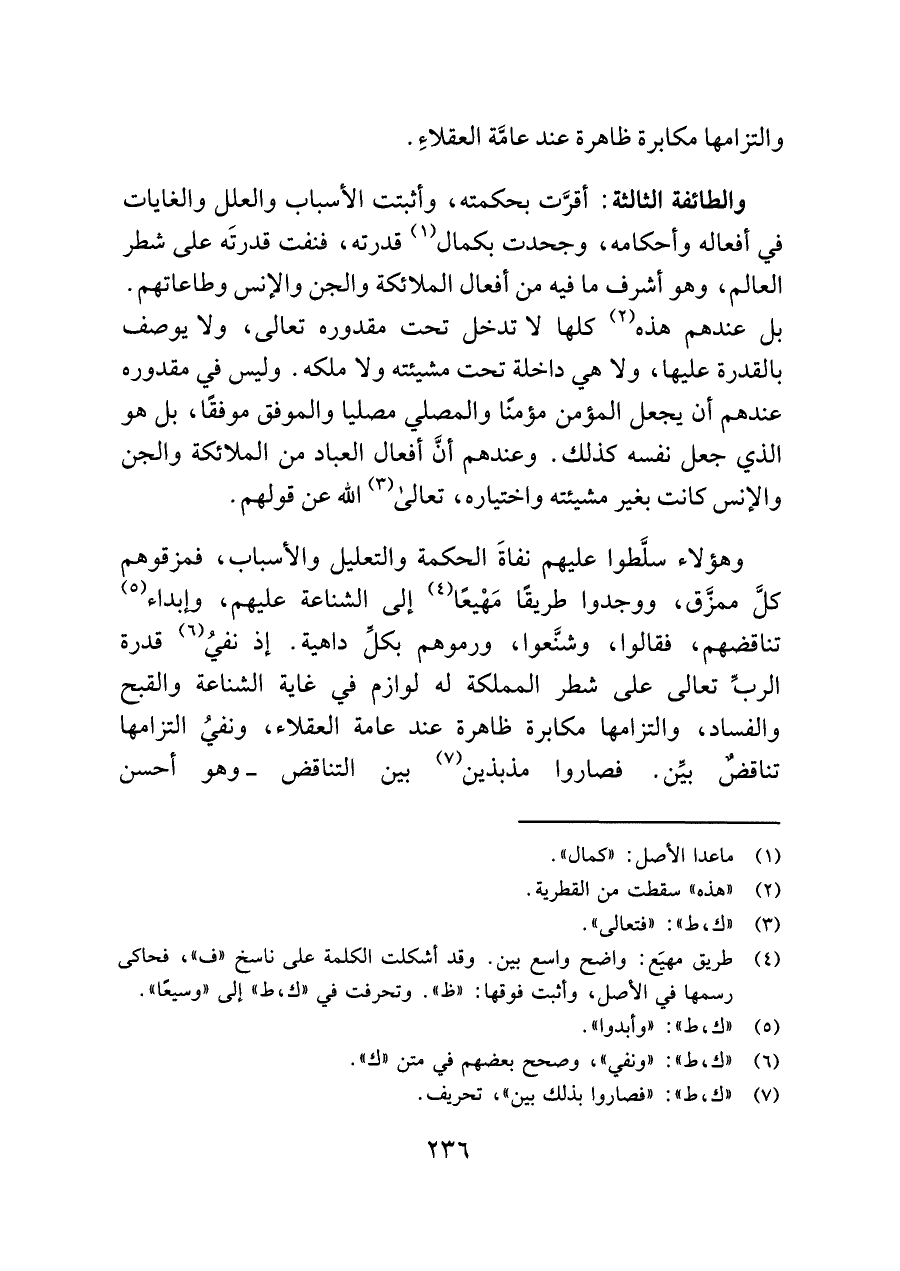 والطائفة الثالثة: أقرَّت بحكمته، وأثبتت الأسباب والعلل والغايات في أفعاله وأحكامه، وجحدت بكمال (¬١) قدرته، فنفت قدرتَه على شطر العالم، وهو أشرف ما فيه من أفعال الملائكة والجن والإنس وطاعاتهم. بل عندهم هذه (¬٢) كلها لا تدخل تحت مقدوره تعالى، ولا يوصف بالقدرة عليها، ولا هي داخلة تحت مشيئته ولا ملكه. وليس في مقدوره عندهم أن يجعل المؤمن مؤمنًا والمصلي مصليا والموفق موفقًا، بل هو الَّذي جعل نفسه كذلك. وعندهم أنَّ أفعال العباد من الملائكة والجن والإنس كانت بغير مشيئته واختياره، تعالى (¬٣) اللَّه عن قولهم.