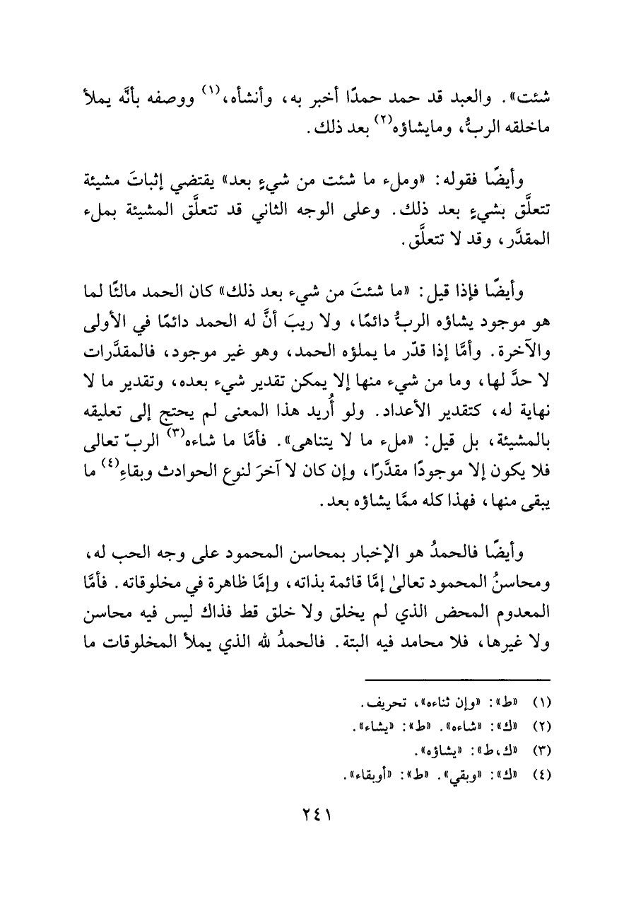 وأيضًا فإذا قيل: "ما شئتَ من شيء بعد ذلك" كان الحمد مالئًا لما هو موجود يشاؤه الربُّ دائمًا، ولا ريبَ أنَّ له الحمد دائمًا في الأُولى والآخرة. وأمَّا إذا قدّر ما يملؤه الحمد، وهو غير موجود، فالمقدَّرات لا حدَّ لها، وما من شيء منها إلا يمكن تقدير شيء بعده، وتقدير ما لا نهاية له، كتقدير الأعداد. ولو أُريد هذا المعنى لم يحتج إلى تعليقه بالمشيئة، بل قيل: "ملء ما لا يتناهى". فأَمَّا ما شاءه (¬٣) الربّ تعالى فلا يكون إلا موجودًا مقدَّرًا، وإن كان لا آخرَ لنوع الحوادث وبقاءِ (¬٤) ما يبقى منها، فهذا كلُّه ممَّا يشاؤه بعد.