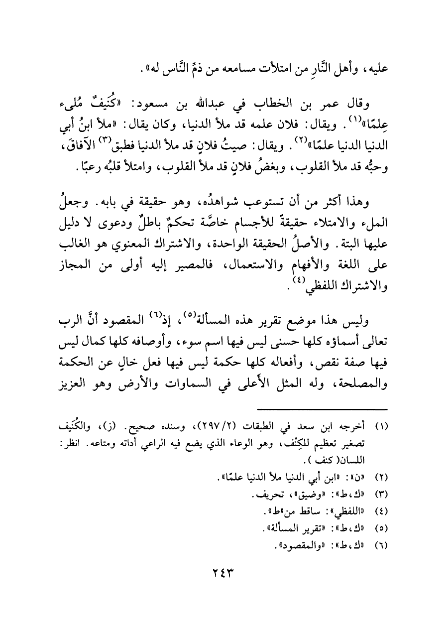 وقال عمر بن الخطاب في عبد اللَّه بن مسعود: "كُنَيفٌ مُلئ عِلمًا" (¬١). ويقال: فلان علمه قد ملأ الدنيا، وكان يقال: "ملأ ابنُ أبي الدنيا الدنيا علمًا" (¬٢). ويقال: صيتُ فلانٍ قد ملأ الدنيا فطبق (¬٣) الآفاقَ، وحبُّه قد ملأ القلوب، وبغضُ فلانٍ قد ملأ القلوب، وامتلأ قلبُه رعبًا.