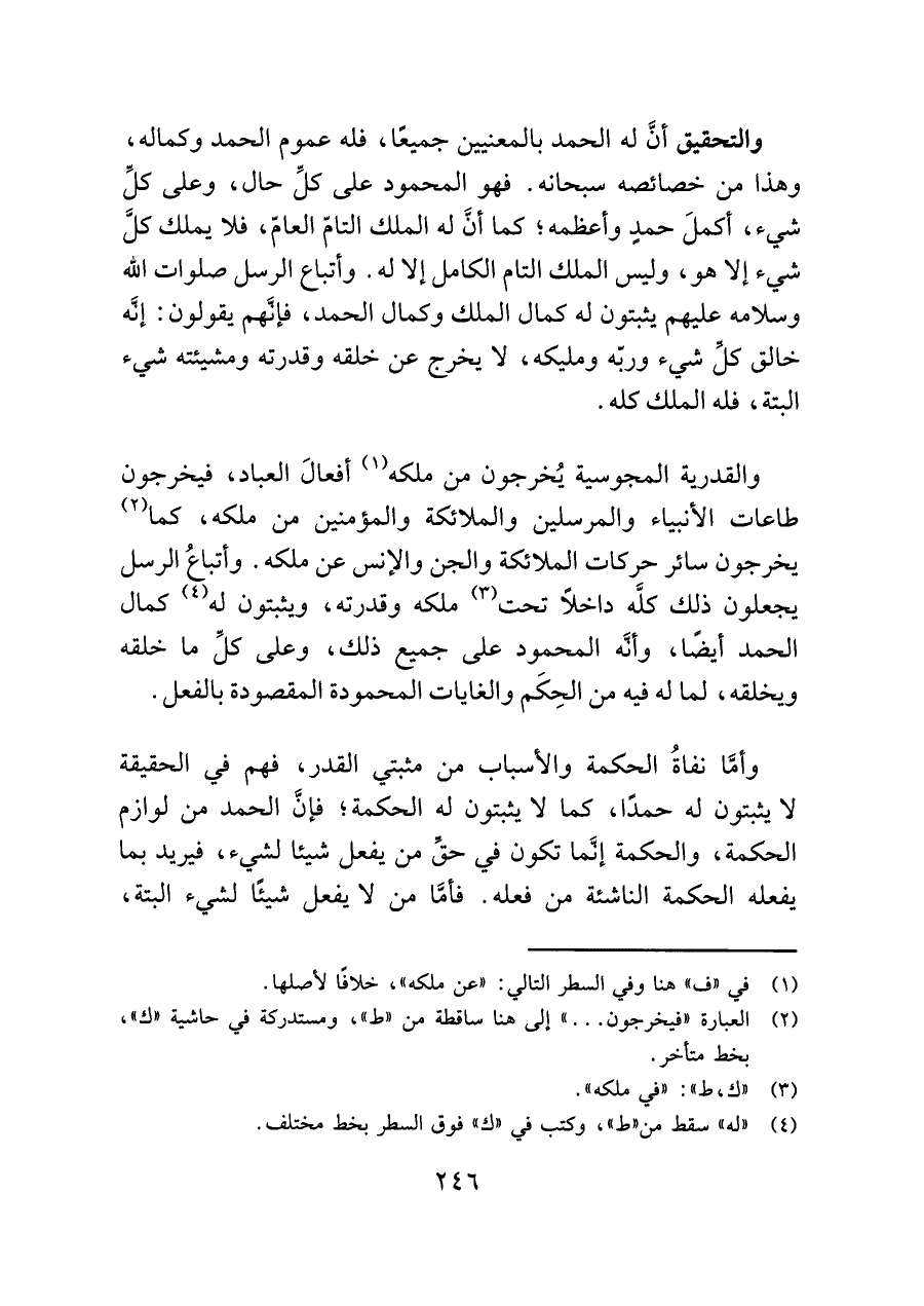 والقدرية المجوسية يُخرجون من ملكه (¬١) أفعالَ العباد، فيخرجون طاعات الأنبياء والمرسلين والملائكة والمؤمنين من ملكه، كما (¬٢) يخرجون سائر حركات الملائكة والجن والإنس عن ملكه. وأتباعُ الرسل يجعلون ذلك كلَّه داخلًا تحت (¬٣) ملكه وقدرته، ويثبتون له (¬٤) كمال الحمد أيضًا، وأنَّه المحمود على جميع ذلك، وعلى كلِّ ما خلقه ويخلقه، لما له فيه من الحِكَم والغايات المحمودة المقصودة بالفعل.