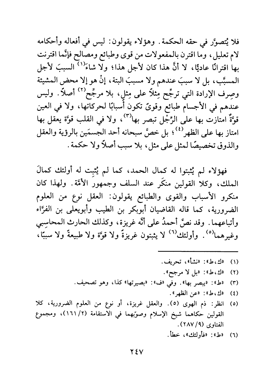 فهؤلاء لم يُثبِتوا له كمال الحمد، كما لم يُثبِت له أولئك كمالَ الملك، وكلا القولين منكَر عند السلف وجمهور الأُمَّة. ولهذا كان منكرو الأسباب والقوى والطبائع يقولون: العقل نوع من العلوم الضرورية، كما قاله القاضيان أبو بكر بن الطيب وأبو يعلى بن الفرَّاء وأتباعهما. وقد نصَّ أحمدُ على أنَّه غريزة، وكذلك الحارث المحاسِبي وغيرهما (¬٥). وأولئك (¬٦) لا يثبتون غريزةً ولا قوَّة ولا طبيعةً ولا سببًا،