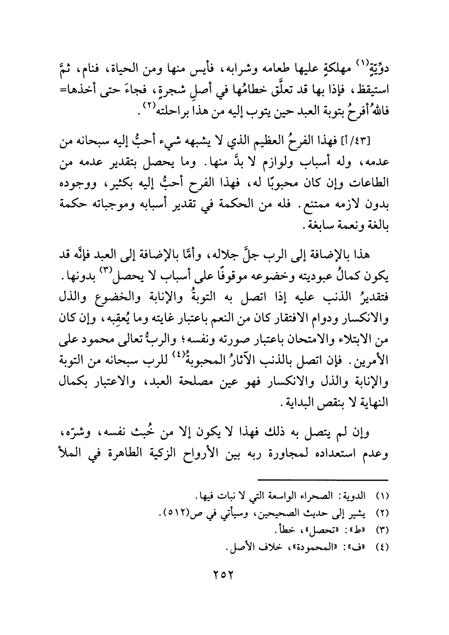 دوِّيَّةٍ (¬١) مهلكةٍ عليها طعامه وشرابه، فأيس منها ومن الحياة، فنام، ثمَّ استيقظ، فإذا بها قد تعلَّق خطامُها في أصلِ شجرةٍ، فجاءَ حتَّى أخذها = فاللَّهُ أفرحُ بتوبة العبد حين يتوب إليه من هذا براحلته (¬٢).