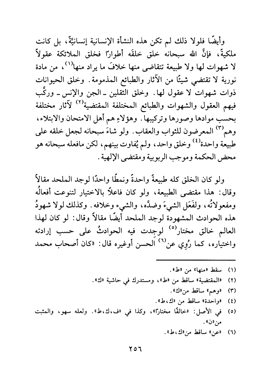 وأيضًا فلولا ذلك لم تكن هذه النشأة الإنسانية إنسانيَّةً، بل كانت ملكيةً، فإنَّ اللَّه سبحانه خلق خلقَه أطوارًا فخلق الملائكة عقولًا لا شهوات لها ولا طبيعة تتقاضى منها خلافَ ما يراد منها (¬١)، من مادة نورية لا تقتضي شيئًا من الآثار والطبائع المذمومة. وخلق الحيوانات ذوات شهوات لا عقول لها. وخلق الثقلين -الجن والإنس- وركَّب فيهم العقول والشهوات والطبائع المختلفة المقتضية (¬٢) لآثار مختلفة بحسب موادها وصورها وتركيبها. وهؤلاءِ هم أهل الامتحان والابتلاء، وهم (¬٣) المعرضون للثواب والعقاب. ولو شاءَ سبحانه لجعل خلقه على طبيعة واحدة (¬٤) وخلق واحد، ولم يُفاوت بينهم، لكن ما فعله سبحانه هو محض الحكمة وموجب الربوبية ومقتضى الإلهية.