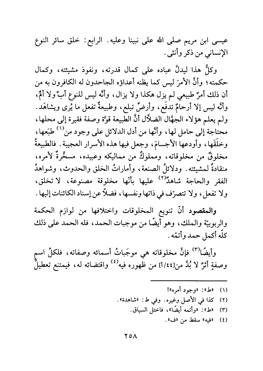 عيسى ابن مريم صلى اللَّه على نبينا وعليه. الرابع: خلق سائر النوع الإنساني من ذكر وأنثى.
