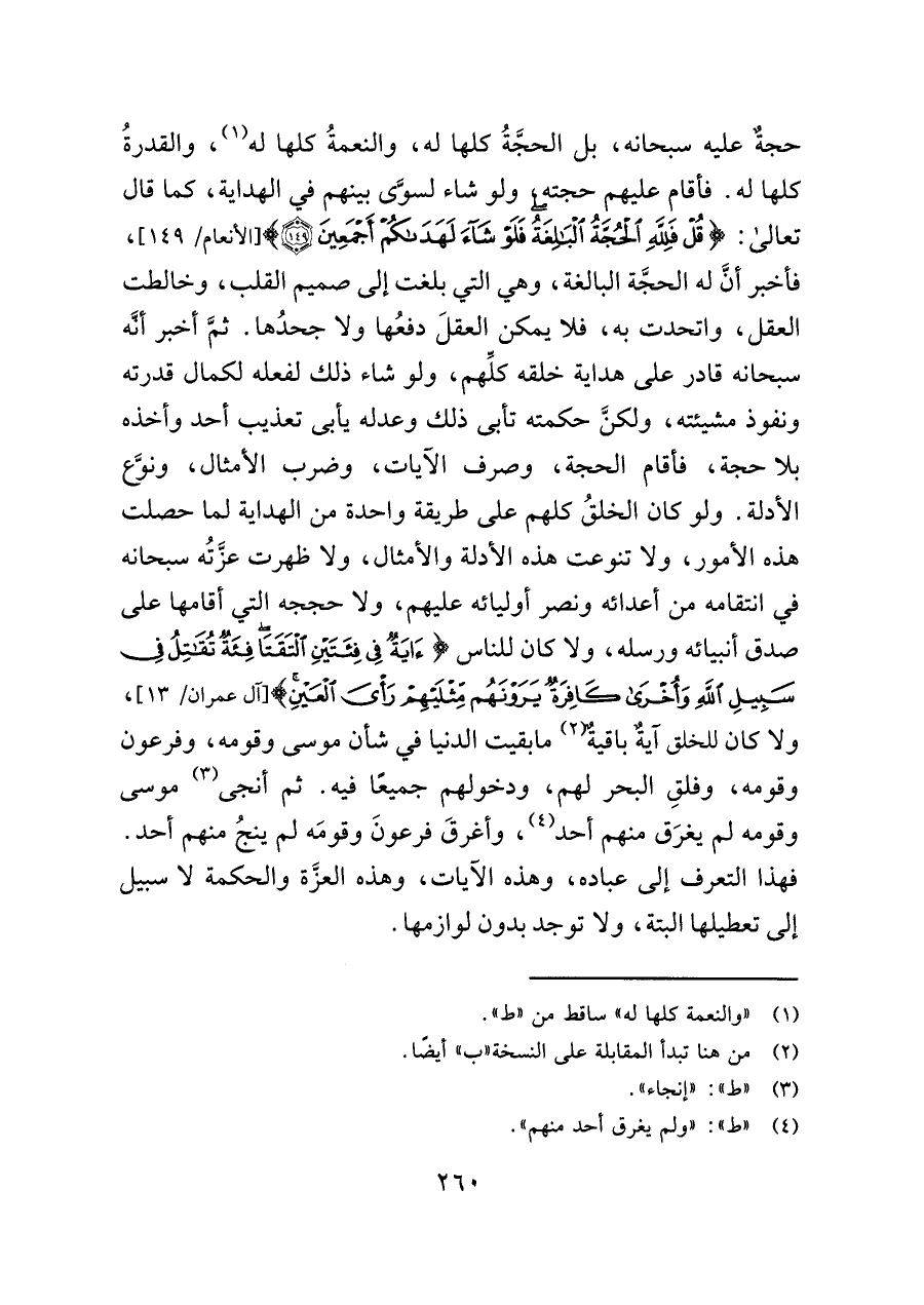 حجةٌ عليه سبحانه، بل الحجَّةُ كلها له، والنعمةُ كلها له (¬١)، والقدرةُ كلها له. فأقام عليهم حجته، ولو شاء لسوَّى بينهم في الهداية، كما قال تعالى: {قُلْ فَلِلَّهِ الْحُجَّةُ الْبَالِغَةُ فَلَوْ شَاءَ لَهَدَاكُمْ أَجْمَعِينَ (١٤٩)} [الأنعام/ ١٤٩]، فأخبر أنَّ له الحجَّة البالغة، وهي التي بلغت إلى صميم القلب، وخالطت العقل، واتحدت به، فلا يمكن العقلَ دفعُها ولا جحدُها. ثمَّ أخبر أنَّه سبحانه قادر على هداية خلقه كلِّهم، ولو شاء ذلك لفعله لكمال قدرته ونفوذ مشيئته، ولكنَّ حكمته تأبى ذلك وعدله يأبى تعذيب أحد وأخذه بلا حجة، فأقام الحجة، وصرف الآيات، وضرب الأمثال، ونوَّع الأدلة. ولو كان الخلقُ كلهم على طريقة واحدة من الهداية لما حصلت هذه الأمور، ولا تنوعت هذه الأدلة والأمثال، ولا ظهرت عزَّتُه سبحانه في انتقامه من أعدائه ونصر أوليائه عليهم، ولا حججه التي أقامها على صدق أنبيائه ورسله، ولا كان للناس {آيَةٌ فِي فِئَتَيْنِ الْتَقَتَا فِئَةٌ تُقَاتِلُ فِي سَبِيلِ اللَّهِ وَأُخْرَى كَافِرَةٌ يَرَوْنَهُمْ مِثْلَيْهِمْ رَأْيَ الْعَيْنِ} [آل عمران/ ١٣]، ولا كان للخق آيةٌ باقيةٌ (¬٢) ما بقيت الدنيا في شأن موسى وقومه، وفرعون وقومه، وفلقِ البحر لهم، ودخولهم جميعًا فيه. ثم أنجى (¬٣) موسى وقومه لم يغرَق منهم أحد (¬٤)، وأغرقَ فرعونَ وقومَه لم ينجُ منهم أحد. فهذا التعرف إلى عباده، وهذه الآيات، وهذه العزَّة والحكمة لا سبيل إلى تعطيلها البتة، ولا توجد بدون لوازمها.