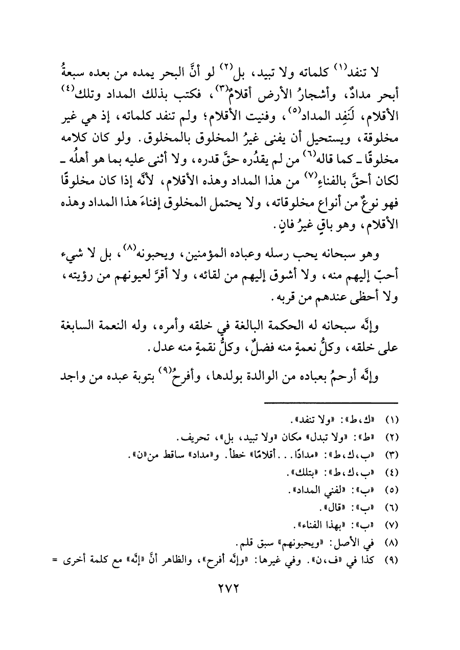 لا تنفد (¬١) كلماته ولا تبيد، بل (¬٢) لو أنَّ البحر يمده من بعده سبعةُ أبحر مدادٌ، وأشجارُ الأرض أقلامٌ (¬٣)، فكتب بذلك المداد وتلك (¬٤) الأقلام، لَنَفِد المداد (¬٥)، وفنيت الأقلام؛ ولم تنفد كلماته، إذ هي غير مخلوقة، ويستحيل أن يفنى غيرُ المخلوق بالمخلوق. ولو كان كلامه مخلوقًا -كما قاله (¬٦) من لم يقدُره حقَّ قدره، ولا أثنى عليه بما هو أهلُه- لكان أحقَّ بالفناءِ (¬٧) من هذا المداد وهذه الأقلام، لأنَّه إذا كان مخلوقًا فهو نوعٌ من أنواع مخلوقاته، ولا يحتمل المخلوق إفناءَ هذا المداد وهذه الأقلام، وهو باقٍ غيرُ فانٍ.
