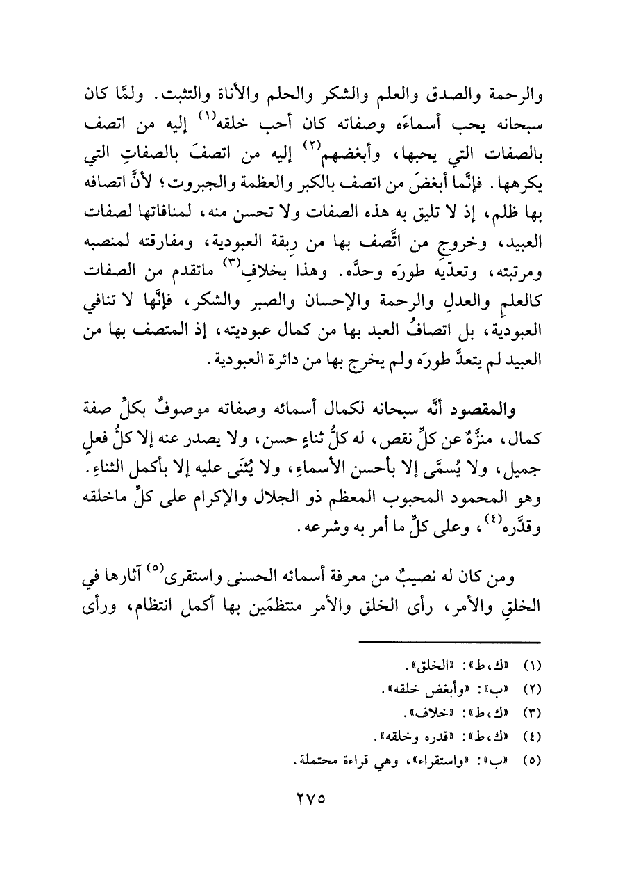 والرحمة والصدق والعلم والشكر والحلم والأناة والتثبت. ولمَّا كان سبحانه يحب أسماءَه وصفاته كان أحب خلقه (¬١) إليه من اتصف بالصفات التي يحبها، وأبغضهم (¬٢) إليه من اتصفَ بالصفاتِ التي يكرهها. فإنَّما أبغضَ من اتصف بالكبر والعظمة والجبروت؛ لأنَّ اتصافه بها ظلم، إذ لا تليق به هذه الصفات ولا تحسن منه، لمنافاتها لصفات العبيد، وخروجِ من اتَّصف بها من رِبقة العبودية، ومفارقته لمنصبه ومرتبته، وتعدّيه طورَه وحدّه. وهذا بخلافِ (¬٣) ما تقدم من الصفات كالعلمِ والعدلِ والرحمة والإحسان والصبر والشكر، فإنَّها لا تنافي العبودية، بل اتصافُ العبد بها من كمال عبوديته، إذ المتصف بها من العبيد لم يتعدَّ طورَه ولم يخرج بها من دائرة العبودية.
