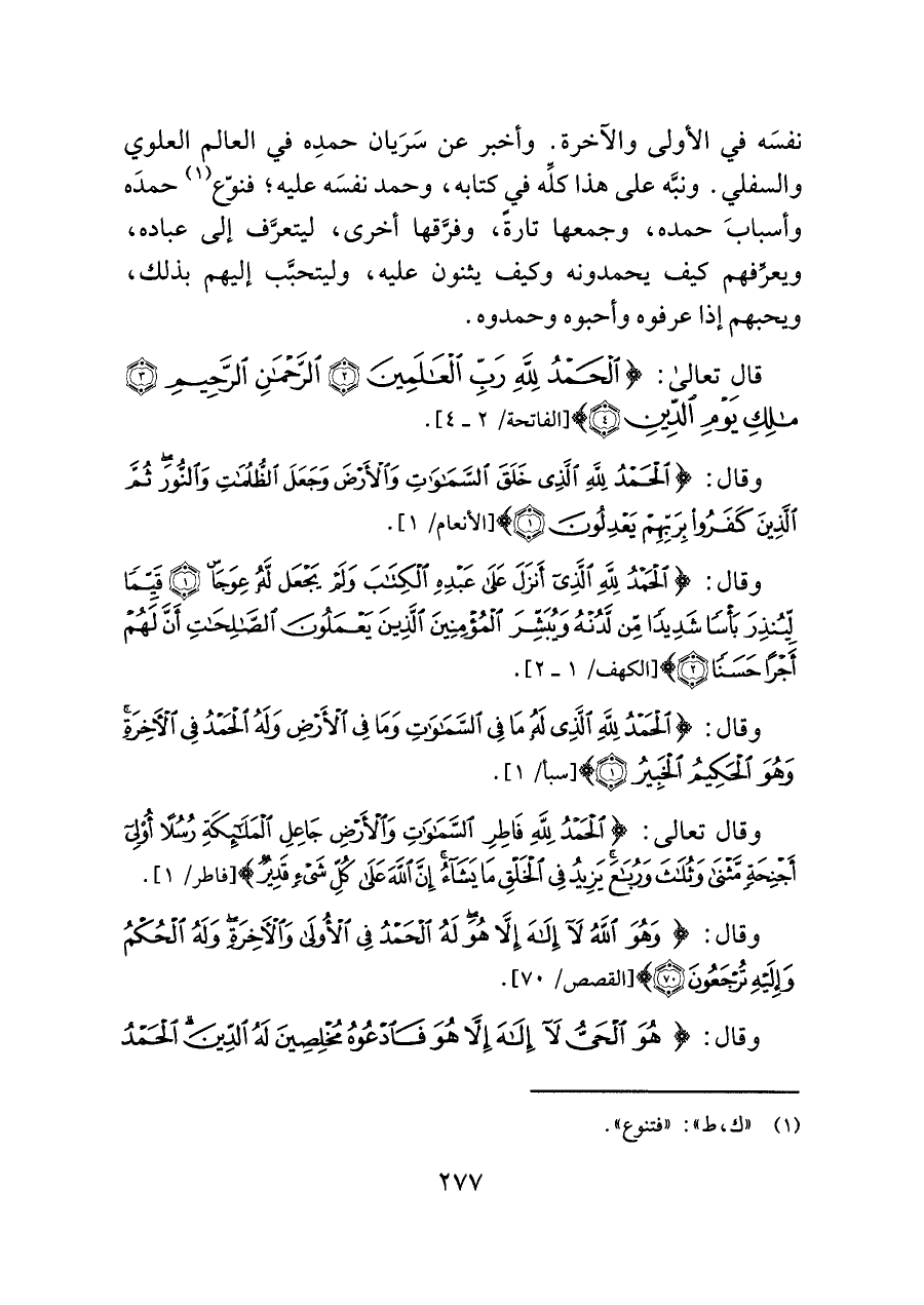 نفسَه في الأولى والآخرة. وأخبر عن سَرَيان حمدِه في العالم العلوي والسفلي. ونبَّه على هذا كلِّه في كتابه، وحمد نفسَه عليه؛ فنوّع (¬١) حمدَه وأسبابَ حمده، وجمعها تارةً، وفرَّقها أخرى، ليتعرَّف إلى عباده، ويعرِّفهم كيف يحمدونه وكيف يثنون عليه، وليتحبَّب إليهم بذلك، ويحبهم إذا عرفوه وأحبوه وحمدوه.
