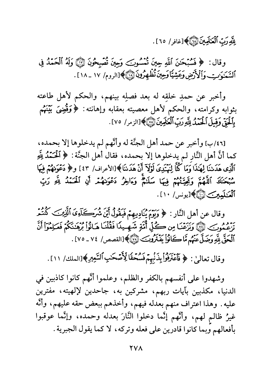 وأخبر عن حمد أهل الجنَّة له وأنَّهم لم يدخلوها إلا بحمده، كما أنَّ أهل النَّارِ لم يدخلوها إلا بحمده، فقال أهل الجنَّة: {الْحَمْدُ لِلَّهِ الَّذِي هَدَانَا لِهَذَا وَمَا كُنَّا لِنَهْتَدِيَ لَوْلَا أَنْ هَدَانَا} [الأعراف/ ٤٣] و {دَعْوَاهُمْ فِيهَا سُبْحَانَكَ اللَّهُمَّ وَتَحِيَّتُهُمْ فِيهَا سَلَامٌ وَآخِرُ دَعْوَاهُمْ أَنِ الْحَمْدُ لِلَّهِ رَبِّ الْعَالَمِينَ} [يونس/ ١٠].