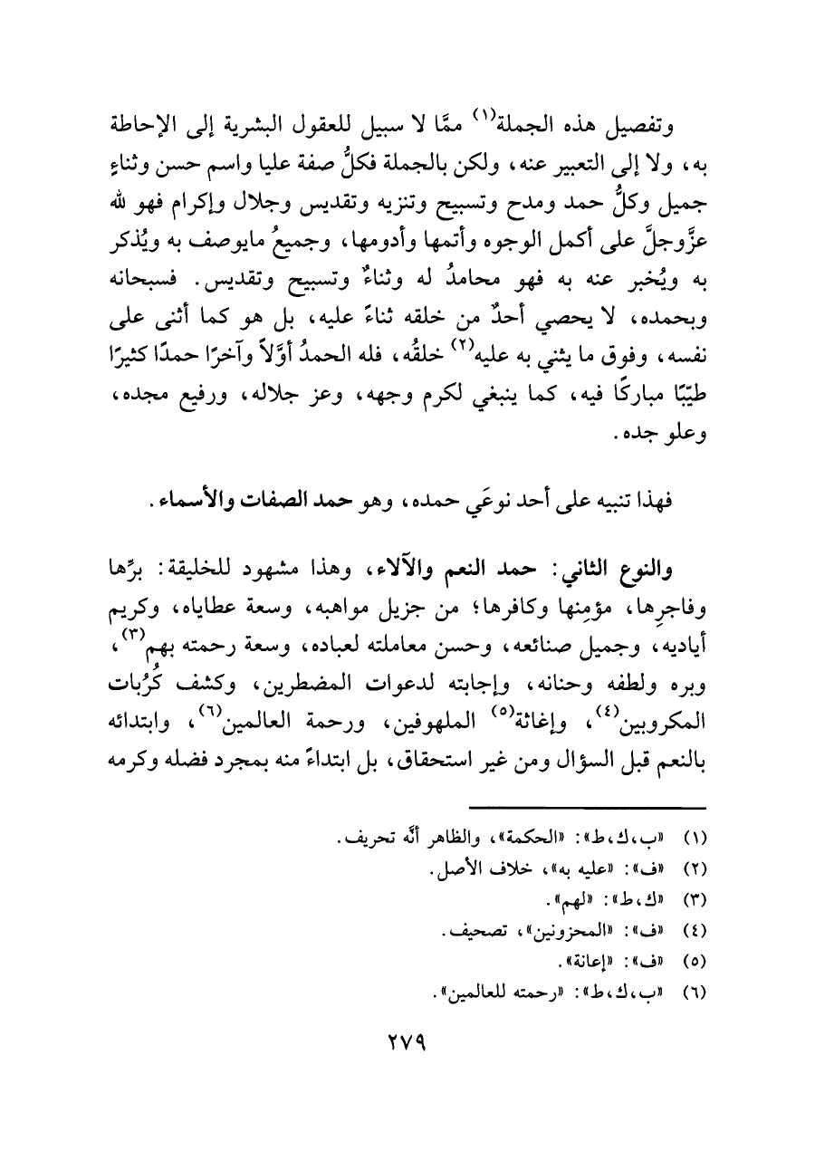 وتفصيل هذه الجملة (¬١) ممَّا لا سبيل للعقول البشرية إلى الإحاطة به، ولا إلى التعبير عنه، ولكن بالجملة فكلُّ صفة عليا واسم حسن وثناءٍ جميل وكلُّ حمد ومدح وتسبيح وتنزيه وتقديس وجلال وإكرام فهو للَّه عزَّ وجلَّ على أكمل الوجوه وأتمها وأدومها، وجميعُ ما يوصف به ويُذكر به ويُخبر عنه به فهو محامدُ له وثناءٌ وتسبيح وتقديس. فسبحانه وبحمده، لا يحصي أحدٌ من خلقه ثناءً عليه، بل هو كما أثنى على نفسه، وفوق ما يثني به عليه (¬٢) خلقُه، فله الحمدُ أوَّلًا وآخرًا حمدًا كثيرًا طيّبًا مباركًا فيه، كما ينبغي لكرم وجهه، وعز جلاله، ورفيع مجده، وعلو جده.