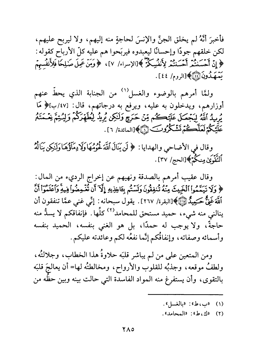 وقال عقيب أمرهم بالصدقة ونهيهم عن إخراج الرديء من المال: {وَلَا تَيَمَّمُوا الْخَبِيثَ مِنْهُ تُنْفِقُونَ وَلَسْتُمْ بِآخِذِيهِ إِلَّا أَنْ تُغْمِضُوا فِيهِ وَاعْلَمُوا أَنَّ اللَّهَ غَنِيٌّ حَمِيدٌ (٢٦٧)} [البقرة/ ٢٦٧]. يقول سبحانه: إنِّي غني عمَّا تنفقون أن ينالني منه شيء، حميد مستحق للمحامد (¬٢) كلِّها. فإنفاقكم لا يسدُّ منه حاجةً، ولا يوجب له حمدًا، بل هو الغني بنفسه، الحميد بنفسه وأسمائه وصفاته، وإنفاقُكم إنَّما نفعُه لكم وعائدته عليكم.