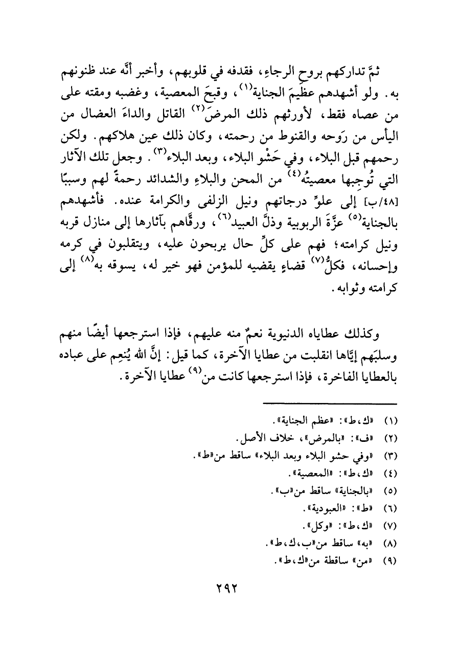 ثمَّ تداركهم بروحِ الرجاءِ، فقدفه في قلوبهم، وأخبر أنَّه عند ظنونهم به. ولو أشهدهم عظيمَ الجناية (¬١)، وقبحَ المعصية، وغضبه ومقته على من عصاه فقط، لأورثهم ذلك المرضَ (¬٢) القاتل والداءَ العضال من الياس من رَوحه والقنوط من رحمته، وكان ذلك عين هلاكهم. ولكن رحمهم قبل البلاء، وفي حَشْو البلاء، وبعد البلاء (¬٣). وجعل تلك الآثار التي تُوجبها معصيتُه (¬٤) من المحن والبلاءِ والشدائد رحمةً لهم وسببًا إلى علوِّ درجاتهم ونيل الزلفى والكرامة عنده. فأشهدهم بالجناية (¬٥) عزَّةَ الربوبية وذلَّ العبيد (¬٦)، ورقَّاهم بآثارها إلى منازل قربه ونيل كرامته؛ فهم على كلِّ حال يربحون عليه، ويتقلبون في كرمه وإحسانه، فكلُّ (¬٧) قضاءٍ يقضيه للمؤمن فهو خير له، يسوقه به (¬٨) إلى كرامته وثوابه.
